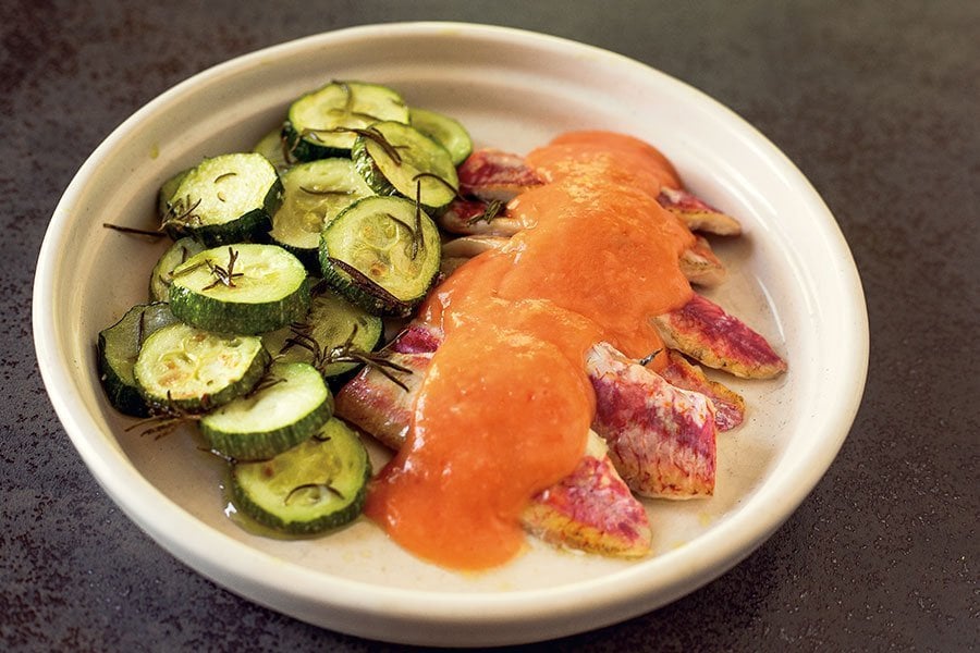 Κόβετε τα κολοκυθάκια σε στρογγυλές, λεπτές φέτες. Βάζετε σε λεκάνη, προσθέτετε λίγο αλάτι, το ελαιόλαδο και φρέσκο δεντρολίβανο και ανακατεύετε. Απλώνετε σε ρηχό ταψί, το οποίο έχετε καλύψει με λαδόκολλα. Ψήνετε στο γκριλ για 20’. Στο ίδιο ταψί βάζετε και τα φιλέτα, με το δέρμα προς τα επάνω. Αλείβετε με ελάχιστο ελαιόλαδο και ψήνετε για 2-3’ μόνο (ανάλογα με το μέγεθος των φιλέτων).