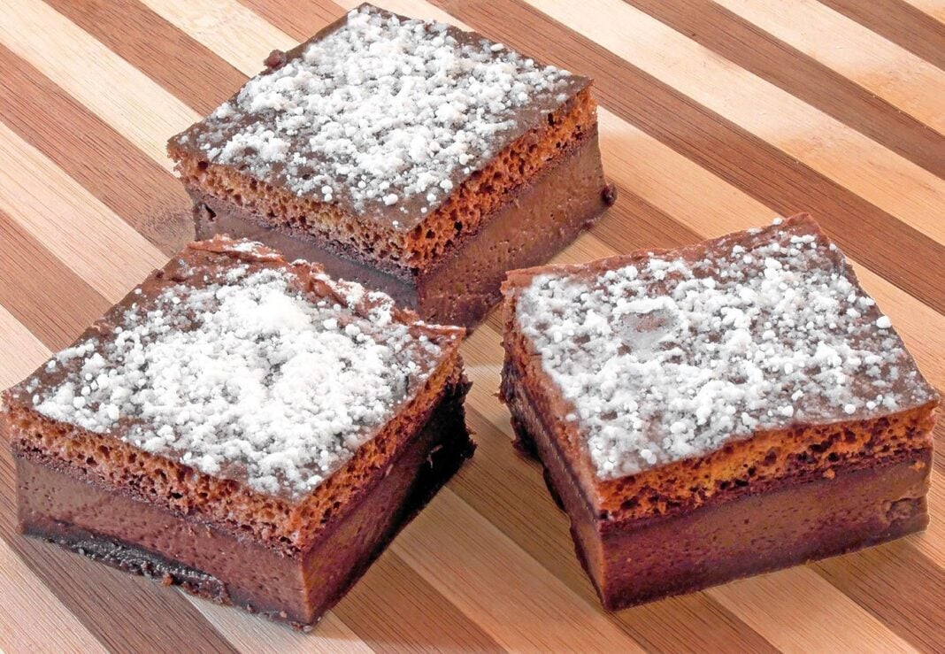 Αδειάζετε το μίγμα στο ταψί και το ψήνετε για 1 περίπου ώρα, ή μέχρι που η επιφάνεια του κέικ να ροδίσει ελαφρά. Αφήνετε το κέικ να κρυώσει εντελώς και ύστερα, το βάζετε στο ψυγείο να παγώσει. Το πασπαλίζετε με μπόλικη ζάχαρη άχνη και το σερβίρετε σε τετράγωνα κομμάτια.