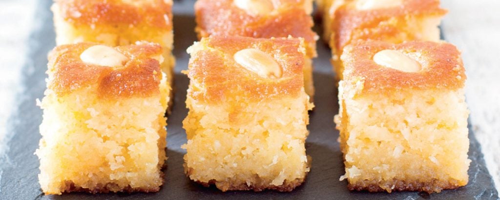 Αδειάστε το μίγμα σε καλά βουτυρωμένο ορθογώνιο ταψάκι 28×38 εκ. περίπου και ισιώνετε την επιφάνεια του με υγρή σπάτουλα. Σκεπάζετε το ταψάκι με πετσέτα και το κρατάτε στην άκρη για 2-3 ώρες, για να μουλιάσει καλά το σιμιγδάλι και να φουσκώσει. Προθερμαίνετε το φούρνο στους 180°C.