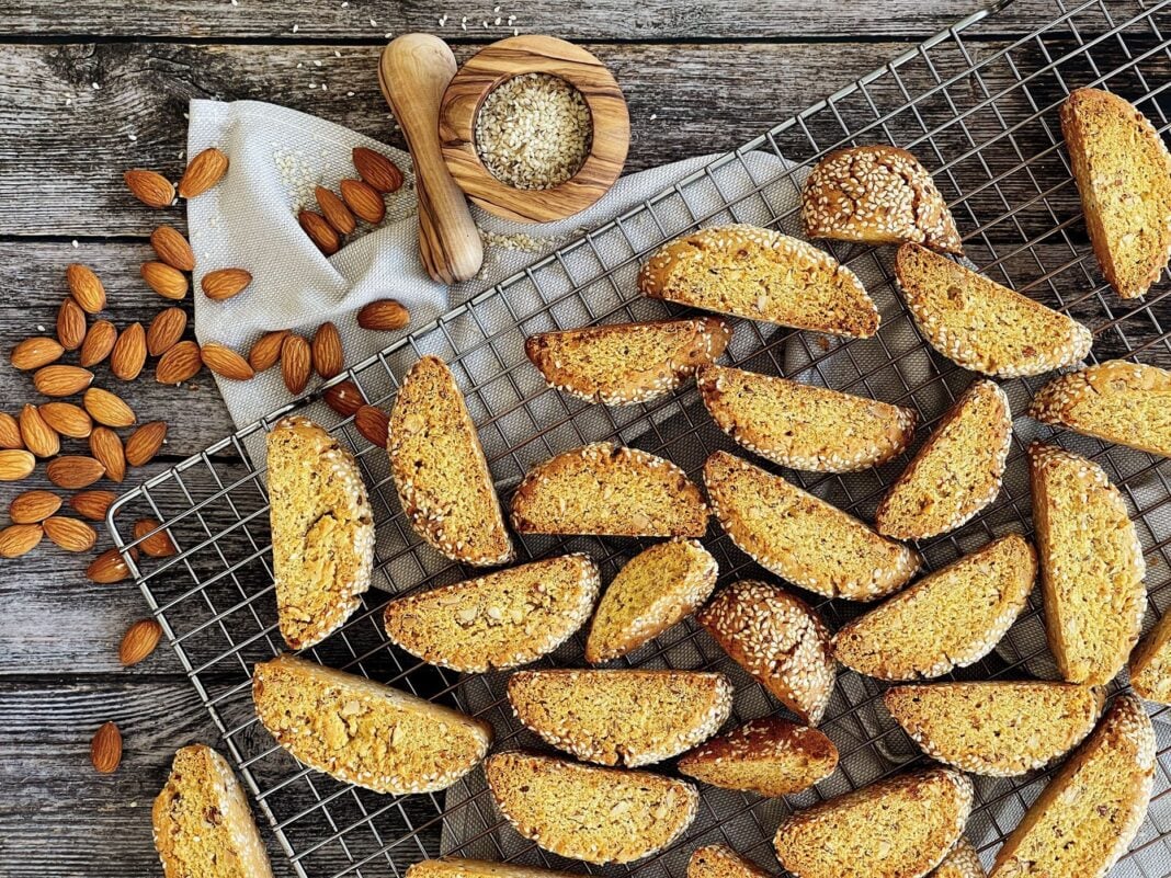 Μεταφέρετε στον φούρνο και ψήνετε στους 175°C, στον αέρα, για 25 λεπτά. Βγάζετε τα ταψιά από το φούρνο και κόβετε τα παξιμαδάκια μέχρι κάτω. Τα γυρίζετε 90 μοίρες ώστε η κομμένη επιφάνεια να είναι προς τα πάνω.