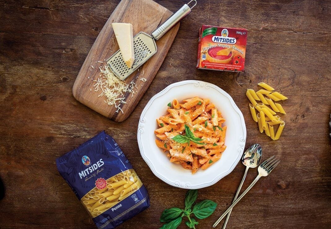 - Η συνταγή περιλαμβάνει πέννες με σάλτσα ντομάτας, βότκα, κρέμα και παρμεζάνα.
