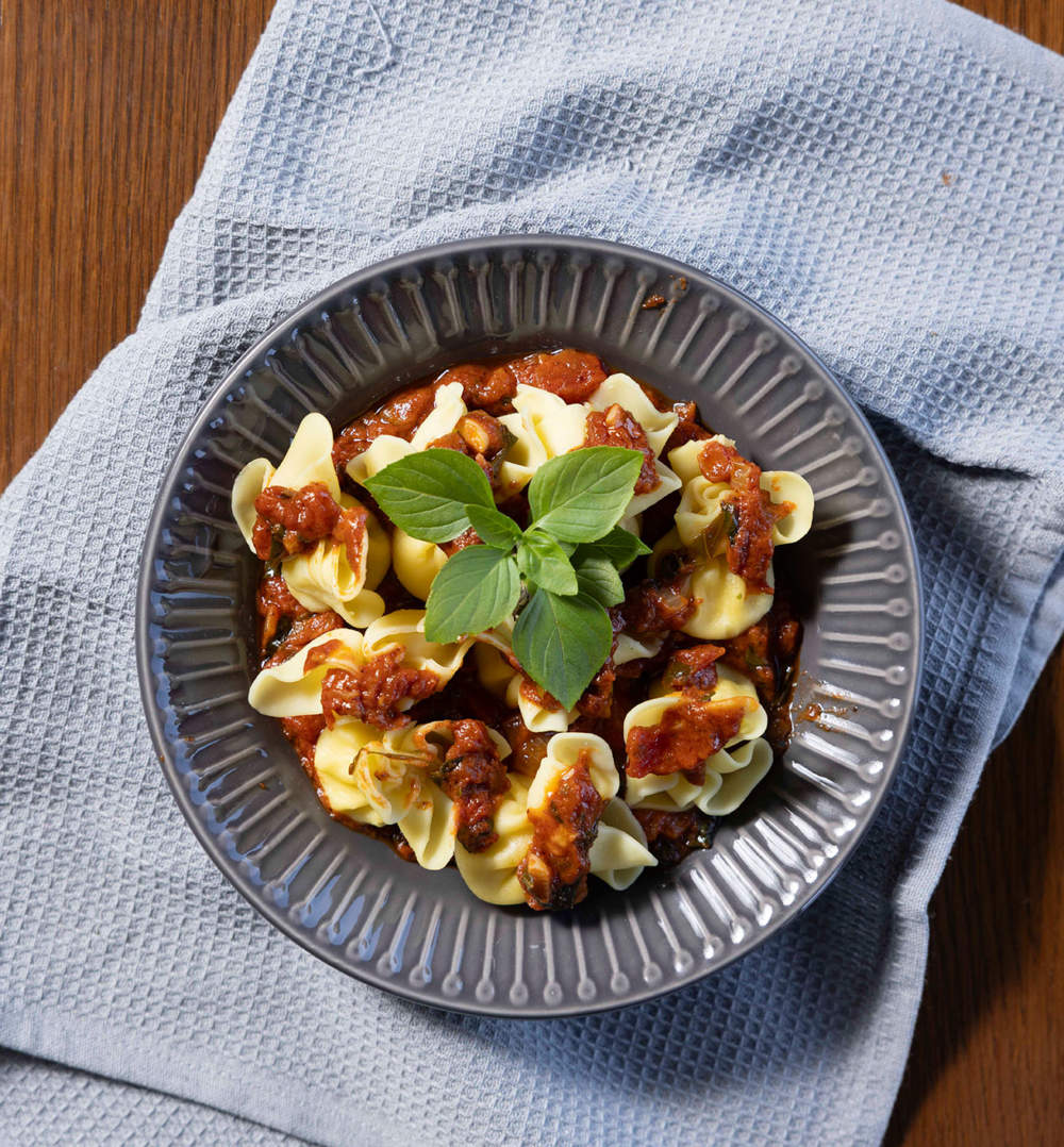 • Το μείγμα σιγοψήνεται με κόκκινο κρασί και εμπλουτίζεται με φρέσκα φύλλα βασιλικού για επιπλέον άρωμα.