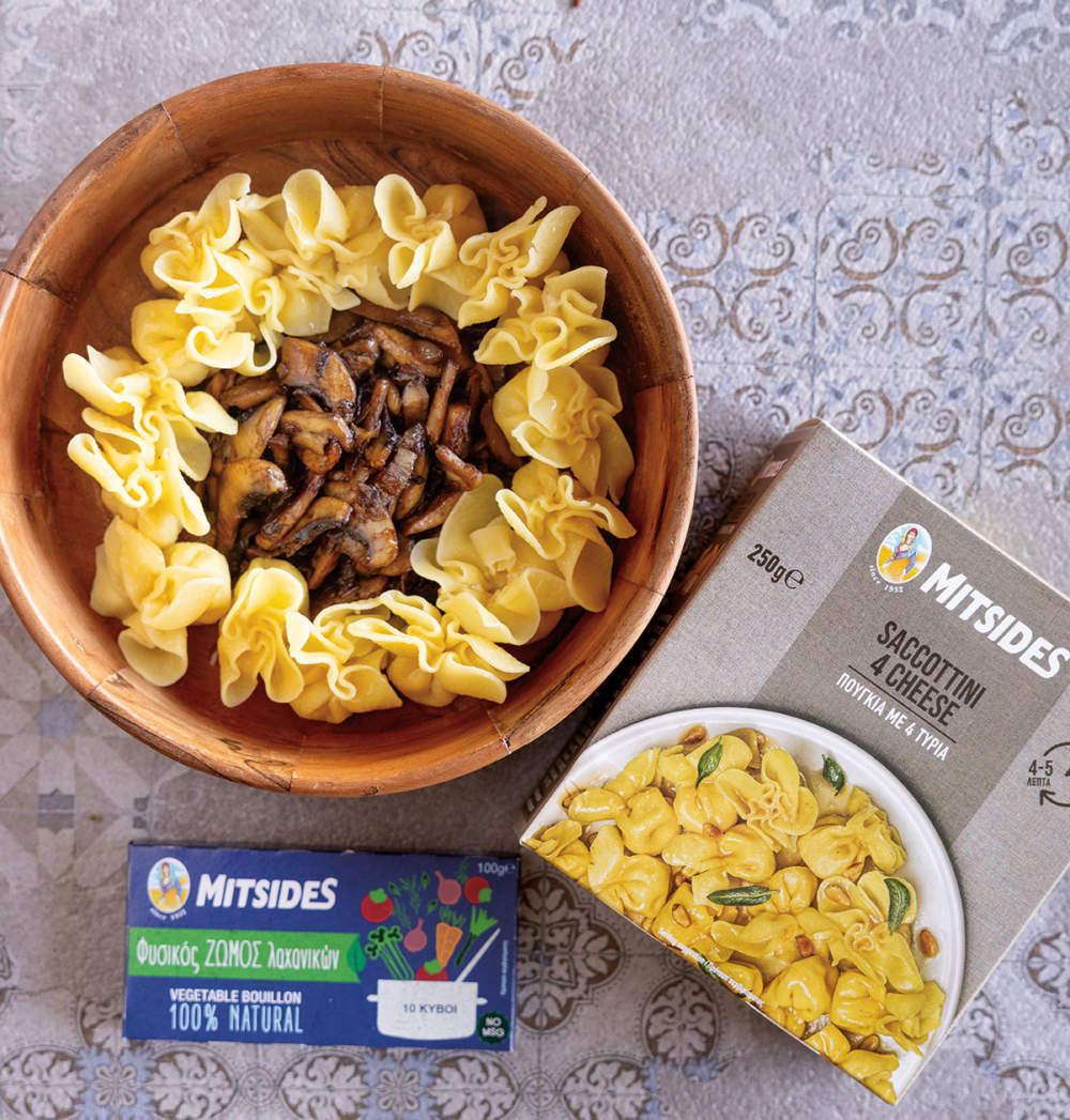 • Η συνταγή περιλαμβάνει πουγκιά με τέσσερα τυριά, μανιτάρια και κουμανταρία, δημιουργώντας έναν γευστικό συνδυασμό.