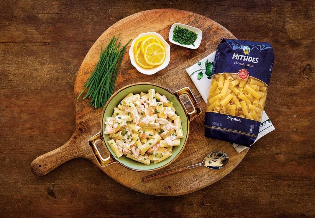 - Η συνταγή περιλαμβάνει ρικατόνι με καπνιστό σολομό, κρέμα, χυμό και ξύσμα λεμονιού.