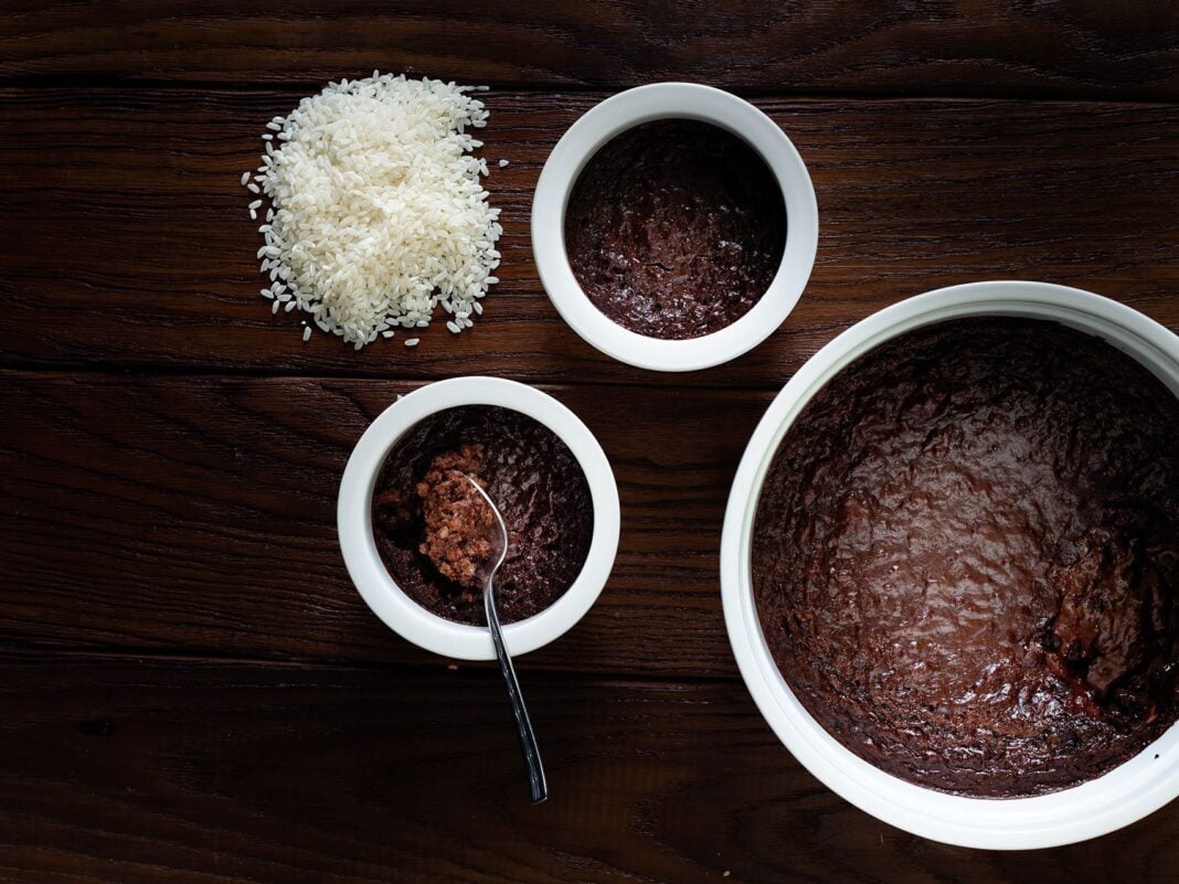 Στη συνέχεια, κακάο, ζάχαρη και γάλα προστίθενται στο μείγμα και μαγειρεύονται σε χαμηλή φωτιά. Αφού το ρυζόγαλο κρυώσει, χτυπημένα αυγά με βανίλια αναμειγνύονται και τοποθετούνται σε ταψί ή μπολάκια.
