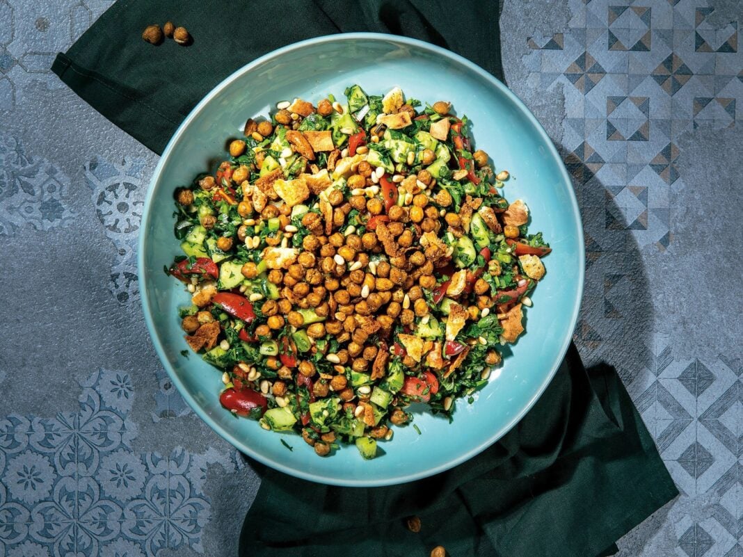 - Η σαλάτα με καυτερά ρεβίθια συνδυάζει κυπριακή πίτα, ντομάτα, αγγούρι, μαϊντανό, κόλιανδρο και κουκουνάρι.