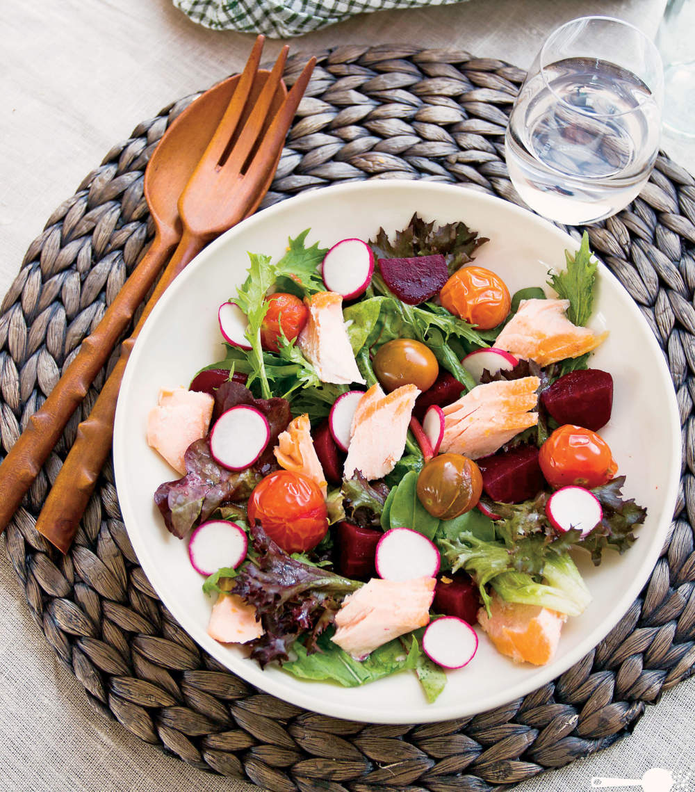 Απλώνετε τα φύλλα της σαλάτας σε 6 ατοµικά πιάτα ή µια πιατέλα, σκορπάτε πάνω τα παντζάρια, το σολοµό και τα φετάκια των ρεπανιών και προσθέτετε τις ντοµάτες. Πριν σερβίρετε, χτυπάτε σε ένα βαζάκι µε τα υλικά του ντρέσινγκ µέχρι να οµογενοποιηθούν και περιχύνετε τη σαλάτα.