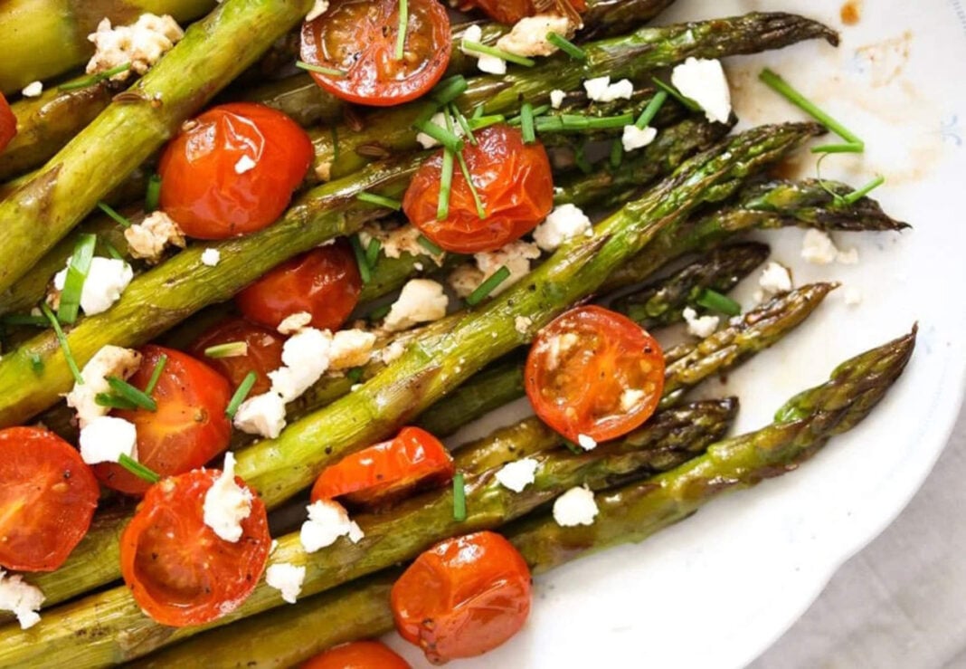 - Η σαλάτα συνδυάζει ψητά σπαράγγια, ντοματίνια και κρουτόν ψωμιού με τριμμένη φέτα.