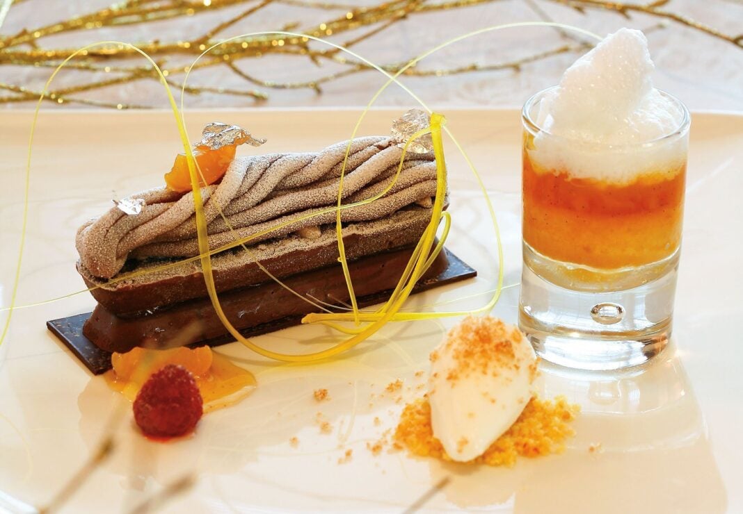 Ετοιµάζετε το µους: Ζεσταίνετε την φρέσκια κρέµα γάλακτος µε τη ζάχαρη µέχρι να διαλυθεί και έπειτα τη προσθέτετε στις σοκολάτες. Αφήνετε το µίγµα να κρυώσει στους 30°C περίπου βαθµούς και ανακατεύετε µέσα τη χτυπηµένη κρέµα. Φορµάρετε το µους και το βάζετε στο ψυγείο για 2 περίπου ώρες.