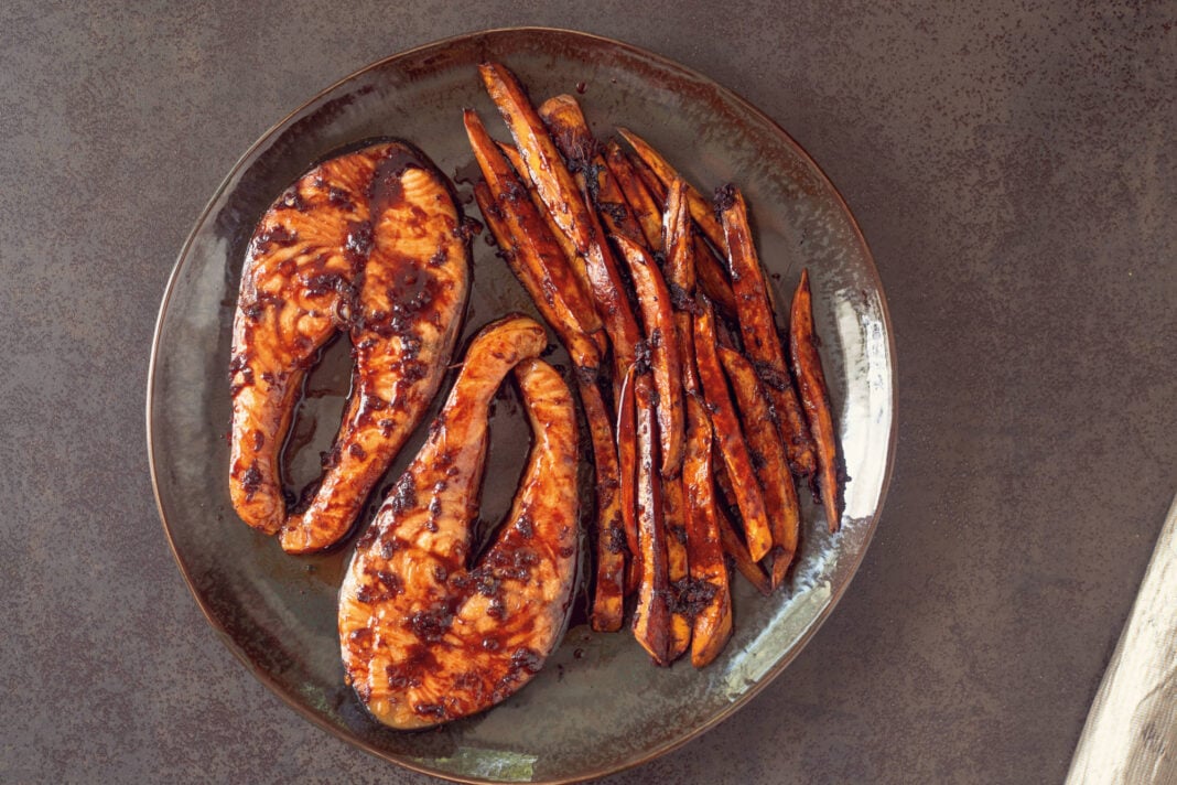 Σολομός με γλυκοπατάτες και χαρουπόμελο