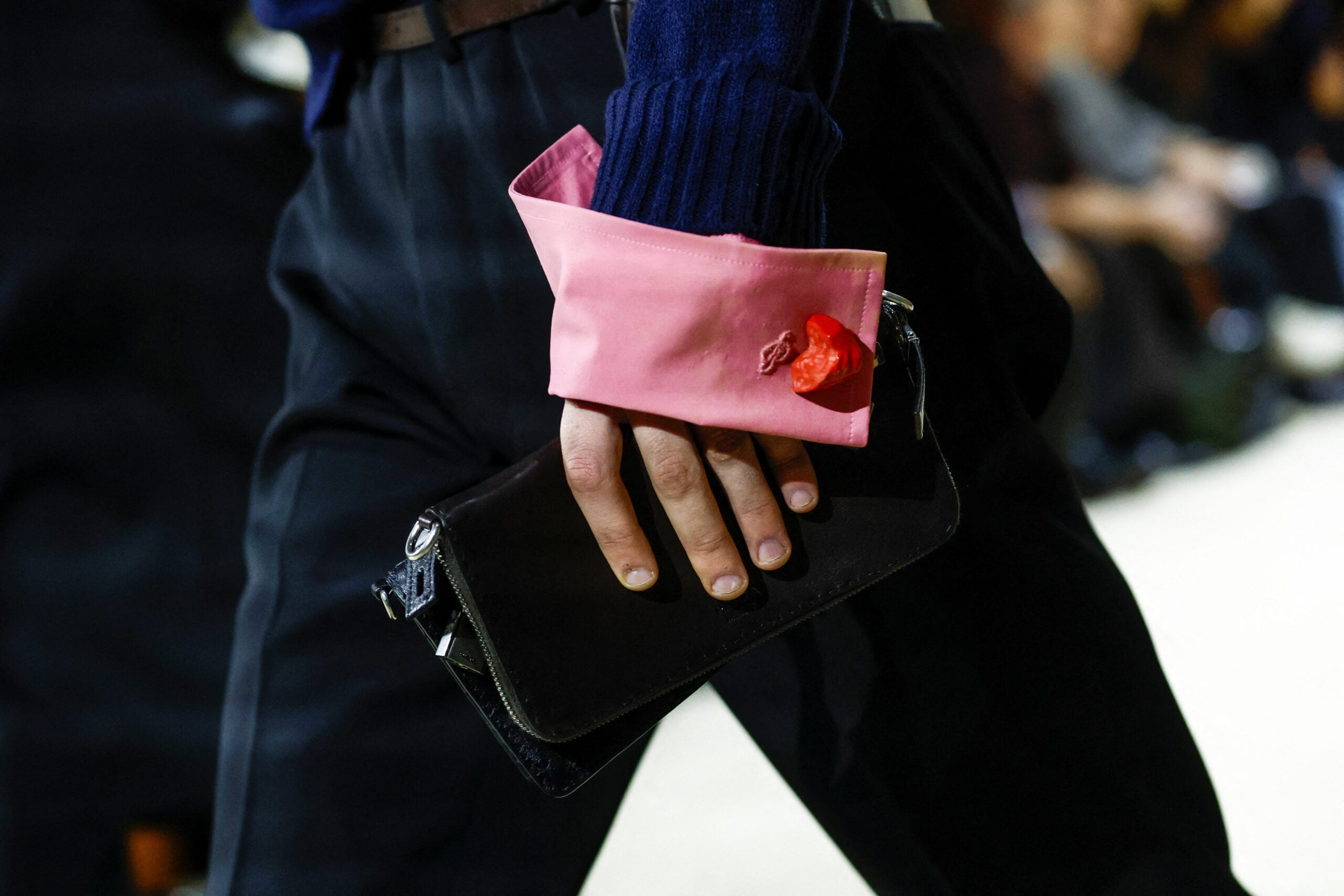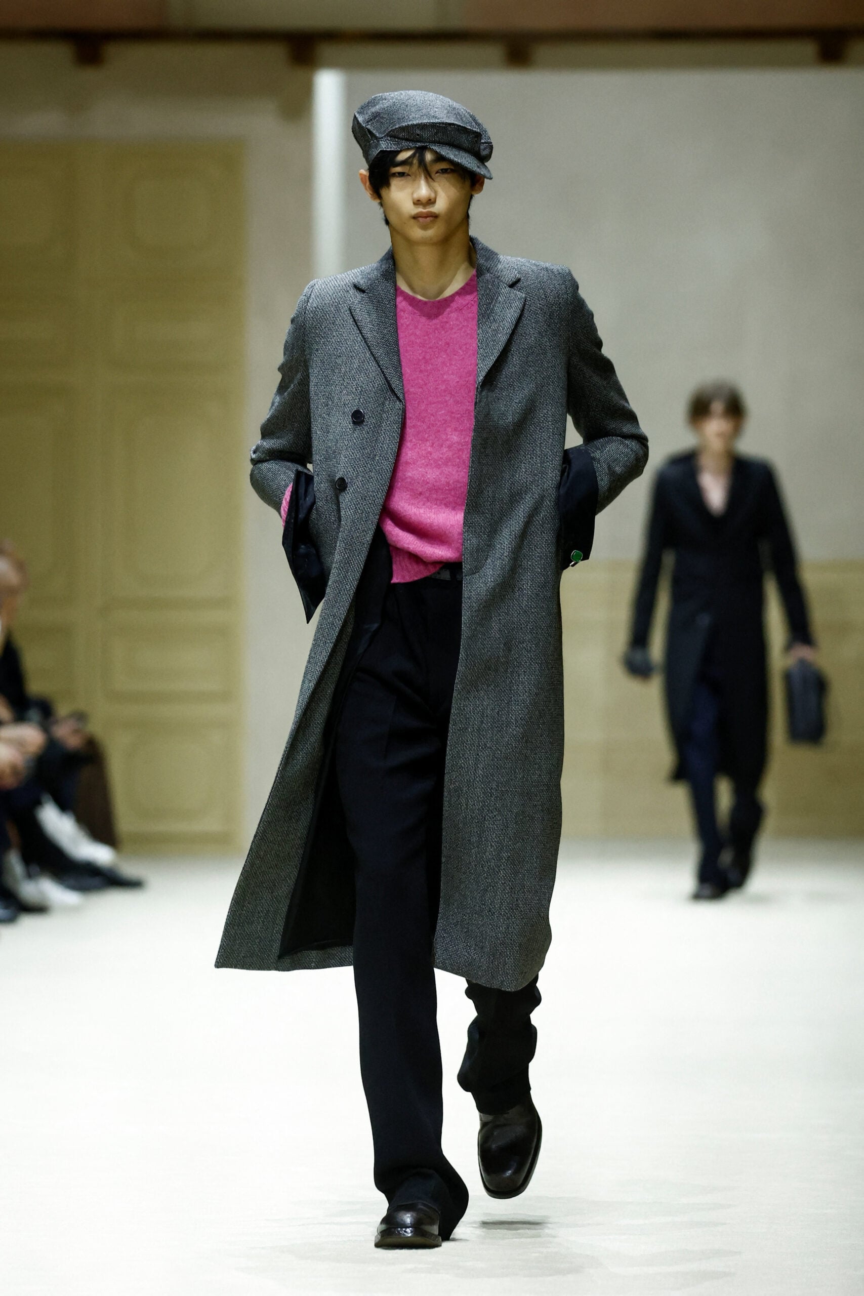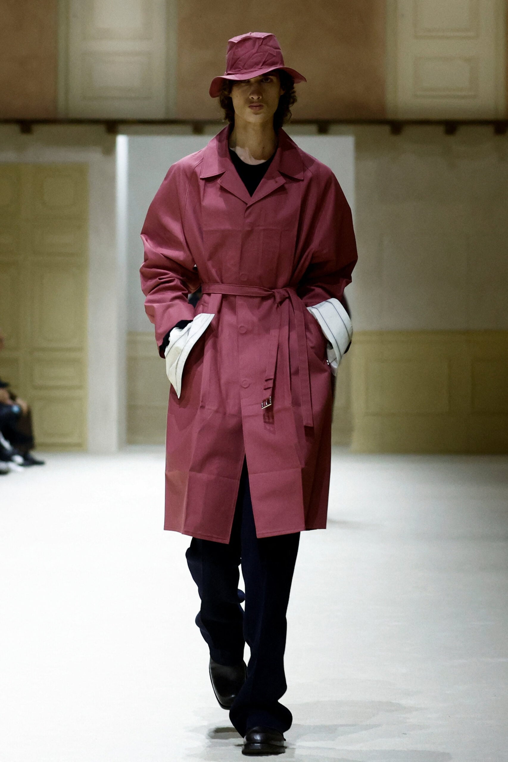 Τα κομμάτια που ξεχώρισαν περιλαμβάνουν φαρδιά παντελόνια, πλεκτά σε έντονες αποχρώσεις, πουκάμισα που κουμπώνουν στην πλάτη, στενά μάλλινα παλτό, αλλά και ροζ πανωφόρια που σπάνε τα στερεότυπα του ανδρικού χρώματος. Οι σιλουέτες άλλοτε χαλαρές και άλλοτε αυστηρές, δημιουργούν έναν νέο κώδικα ντυσίματος για τον άνδρα του αύριο: ευαίσθητο, τολμηρό, ελεύθερο από στερεότυπα.