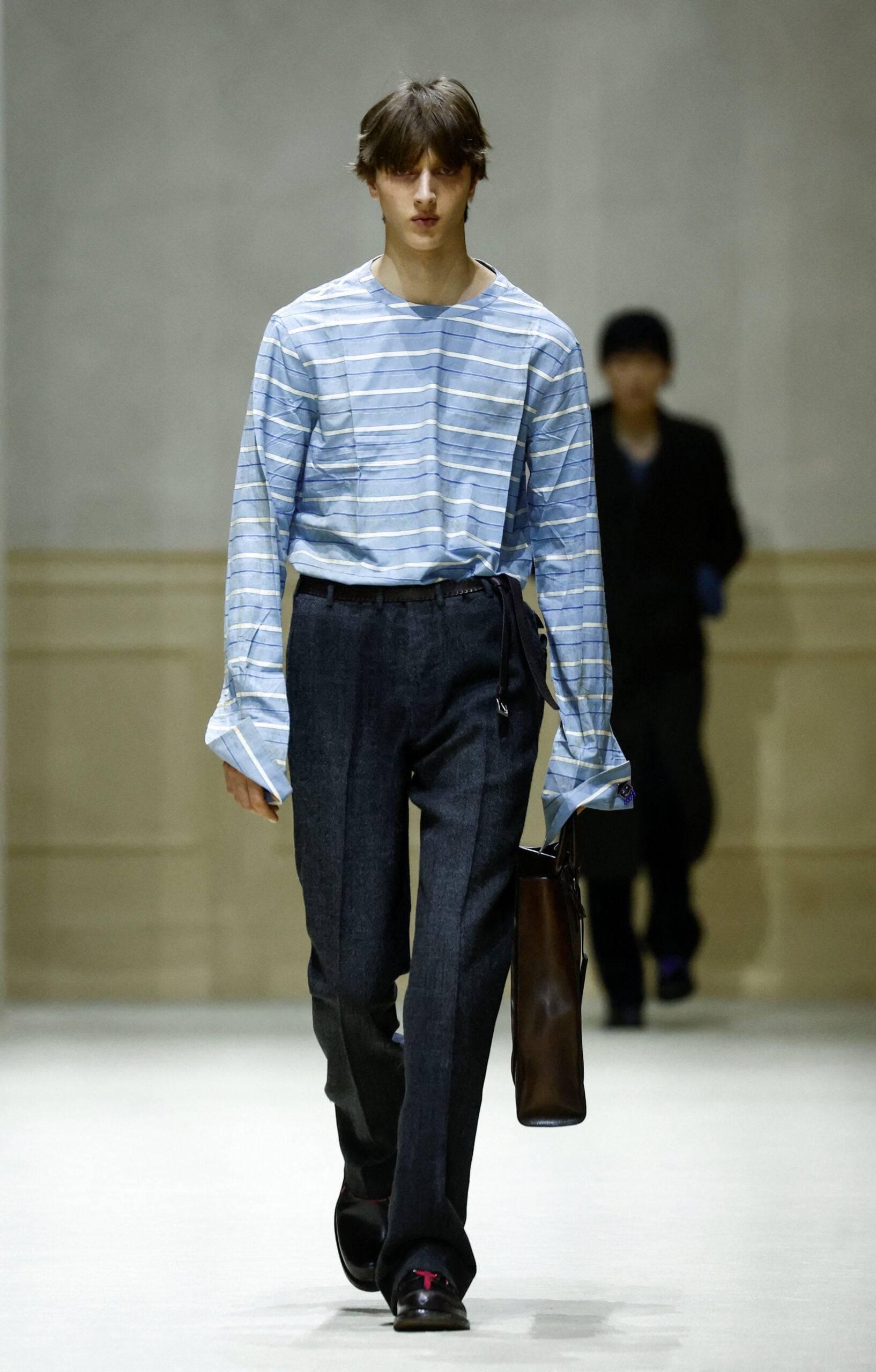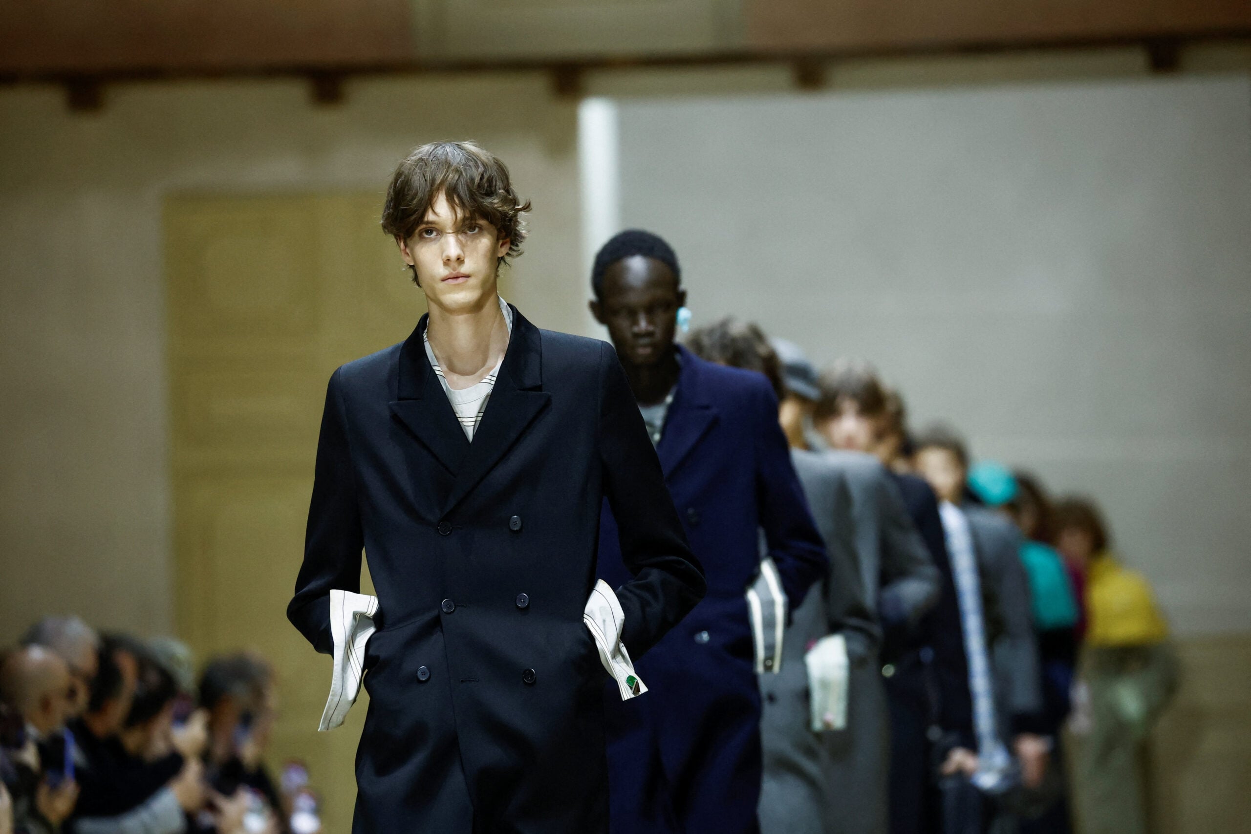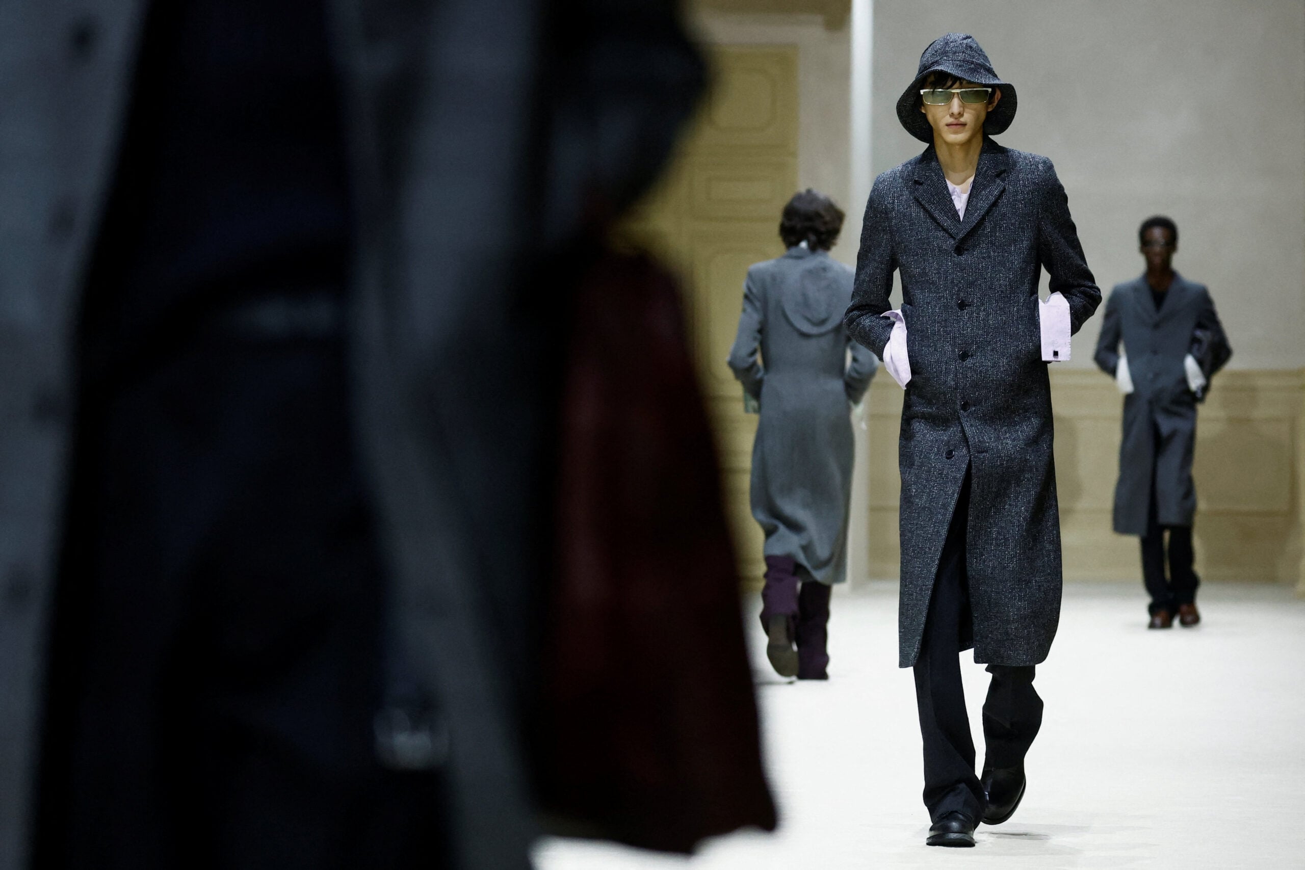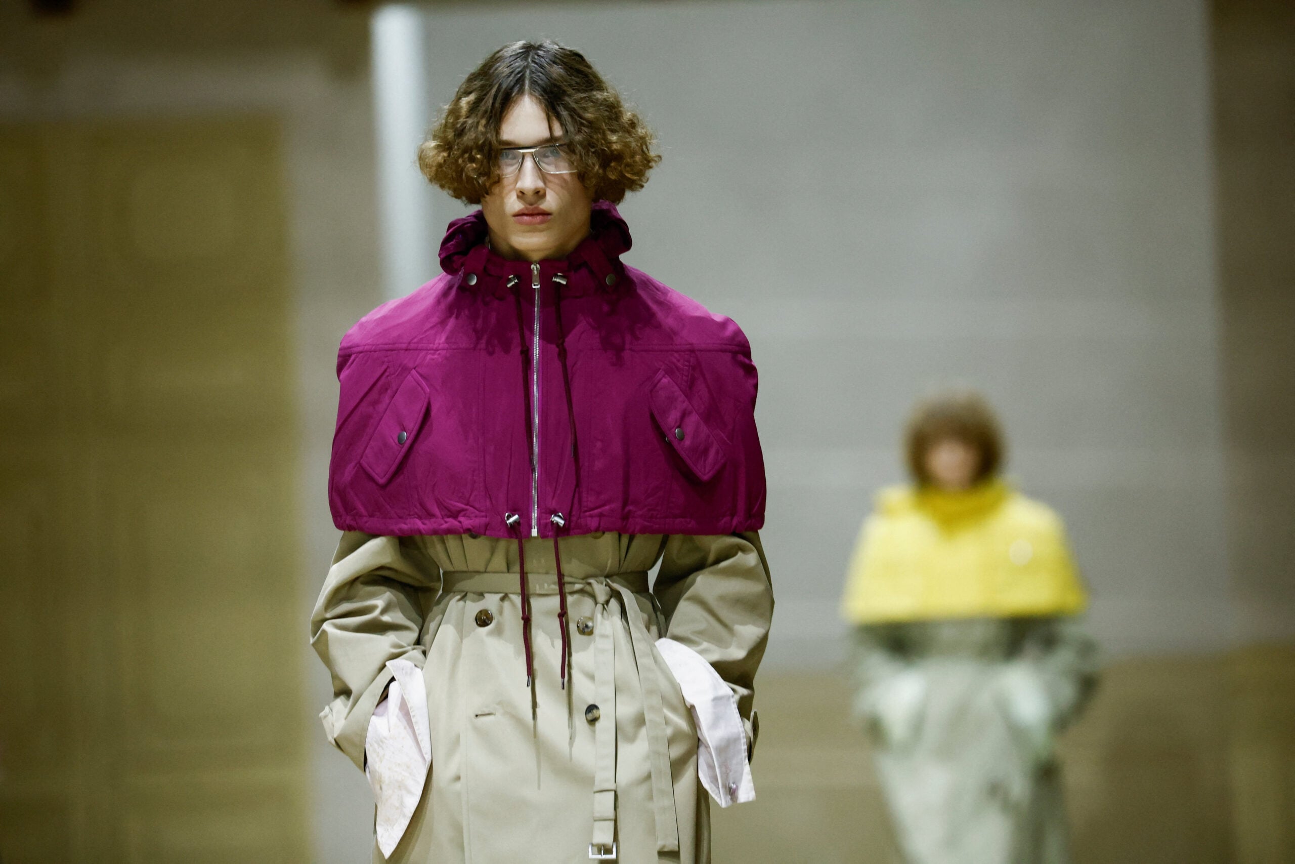 Τα κομμάτια που ξεχώρισαν περιλαμβάνουν φαρδιά παντελόνια, πλεκτά σε έντονες αποχρώσεις, πουκάμισα που κουμπώνουν στην πλάτη, στενά μάλλινα παλτό, αλλά και ροζ πανωφόρια που σπάνε τα στερεότυπα του ανδρικού χρώματος. Οι σιλουέτες άλλοτε χαλαρές και άλλοτε αυστηρές, δημιουργούν έναν νέο κώδικα ντυσίματος για τον άνδρα του αύριο: ευαίσθητο, τολμηρό, ελεύθερο από στερεότυπα.