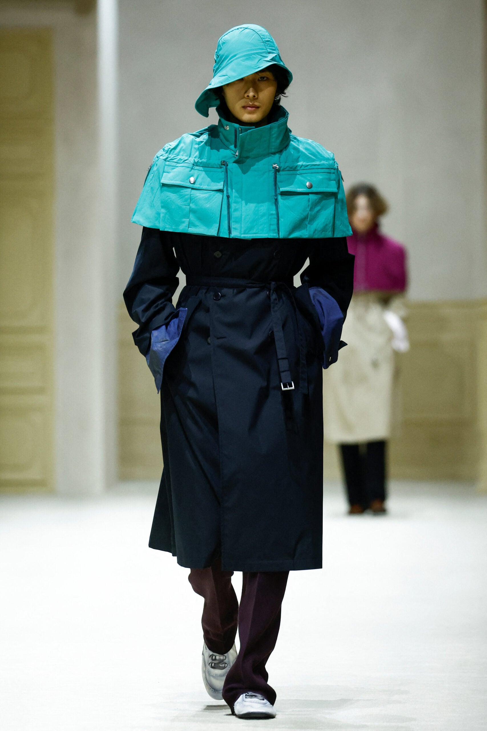 Στην πασαρέλα κυριάρχησαν anoraks με ασορτί rain hats, λεπτομέρειες όπως μανσέτες που ξεπρόβαλλαν από τα πανωφόρια, πολύτιμα μανικετόκουμπα, σκουλαρίκια στα αυτιά, αλλά και statement καπέλα, έντονα χρώματα, structured τσάντες και sneakers, συνθέτοντας ένα σύμπαν όπου η λειτουργικότητα γίνεται luxury στοιχείο. Η συλλογή απέδειξε πως το utility dressing δεν είναι απλώς πρακτικό – μπορεί να είναι και υψηλής αισθητικής.
