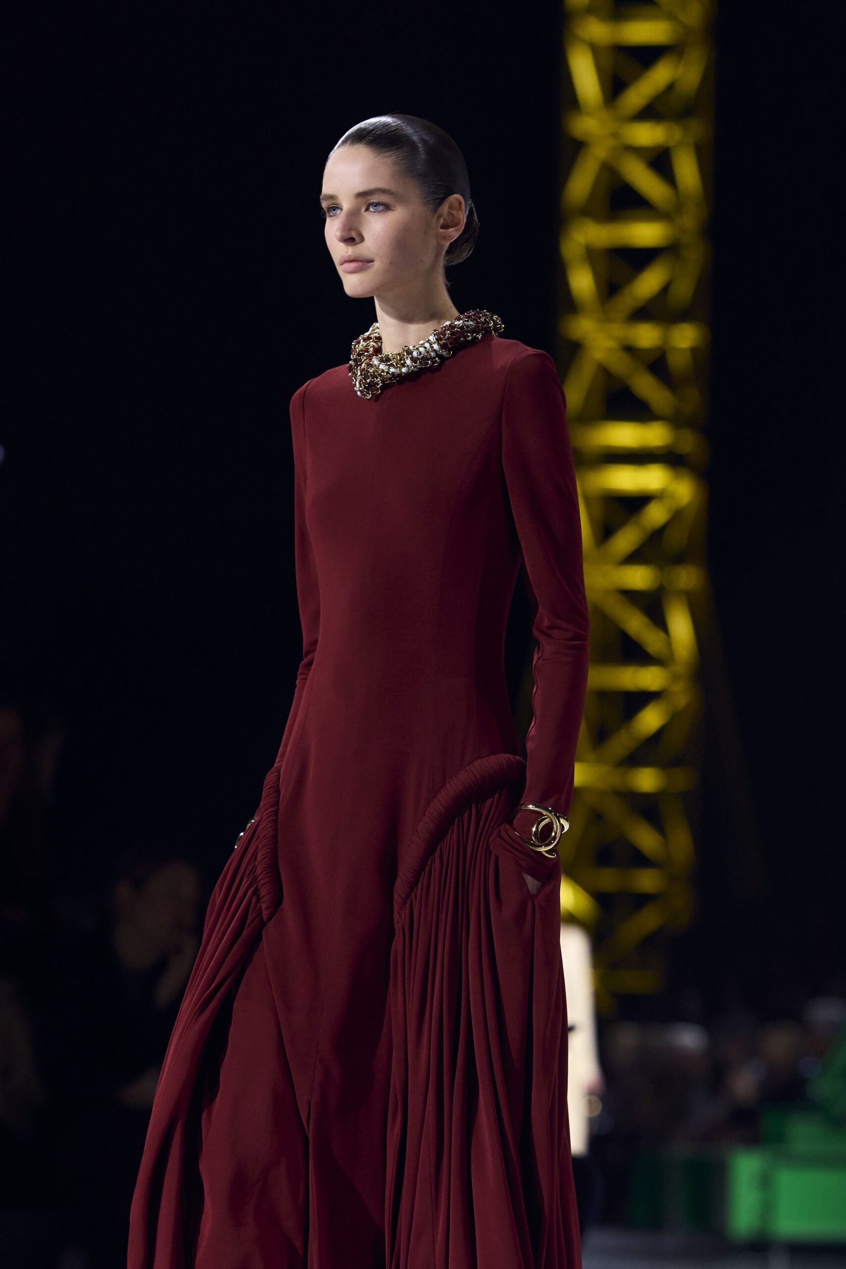 Καθώς η συλλογή εξελίσσεται, η αίσθηση της λάμψης και της ρευστότητας γίνεται όλο και πιο έντονη. Τα μεταξωτά υφάσματα, οι ιριδίζουσες επιφάνειες και οι ρευστές γραμμές σηματοδοτούν τη μετάβαση από τον κόσμο της ημέρας στον κόσμο της νύχτας.