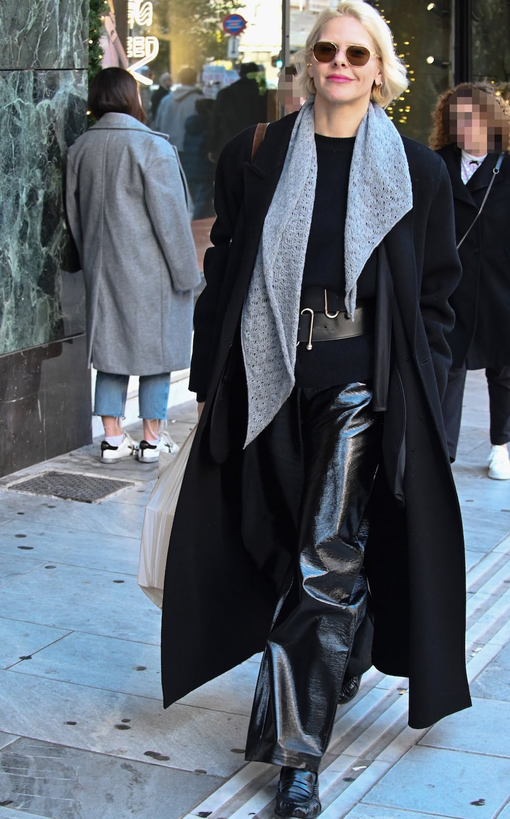 Σε ένα outfit με μαύρη μπλούζα, μαύρο παλτό, γυαλιστερό παντελόνι σε μαύρο χρώμα, μαύρη ζώνη με περίτεχνο σχέδιο και μαύρα γυαλιστερά loafers, έκανε τη διαφορά με μία γκρι πινελιά, με ένα μακρύ κασκόλ.