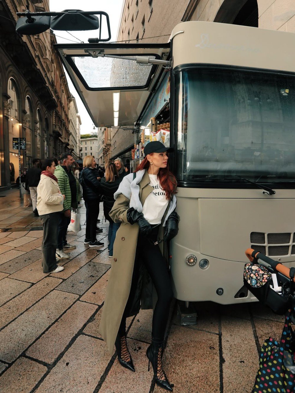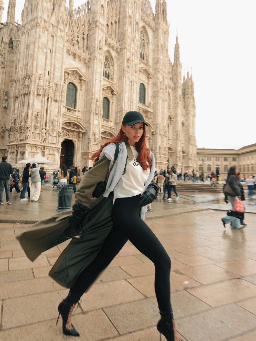 Η Έβελυν Καζαντζόγλου εντυπωσίασε με το μοναδικό της στιλ, συνδυάζοντας αθλητικά κομμάτια με high-fashion στοιχεία σε ένα εντυπωσιακό athleisure look. Φορώντας μια κλασική καμπαρντίνα πάνω από ένα γκρι hoodie και μαύρο lycra κολάν, κατάφερε να δημιουργήσει μια ισορροπημένη αντίθεση ανάμεσα στην κομψότητα και την άνεση.