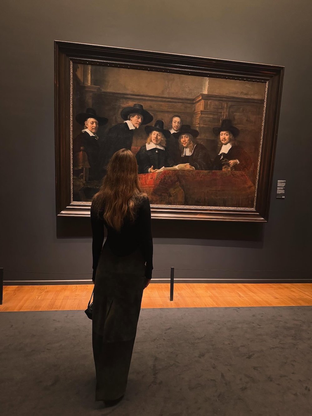 Είναι προφανές πως η Ευγενία επιλέγει συνειδητά κάθε κομμάτι που θα φορέσει, γνωρίζοντας πού θα σταθεί και τι θα αντικρίσει. Τα ρούχα της μοιάζουν να συνομιλούν άπταιστα με τα έργα μπροστά στα οποία φωτογραφίζεται. Στο περιβάλλον των μουσείων, η φούστα γίνεται μέρος της σύνθεσης. Ο τρόπος που το φως ακουμπά πάνω στο suede θυμίζει τις σκιές ενός πίνακα του Ρέμπραντ, ενώ η αυστηρή της γραμμή επαναφέρει κάτι από τη γεωμετρία του μινιμαλισμού. Είναι μια στιγμή όπου το ρούχο και ο χώρος μοιράζονται το ίδιο βλέμμα.