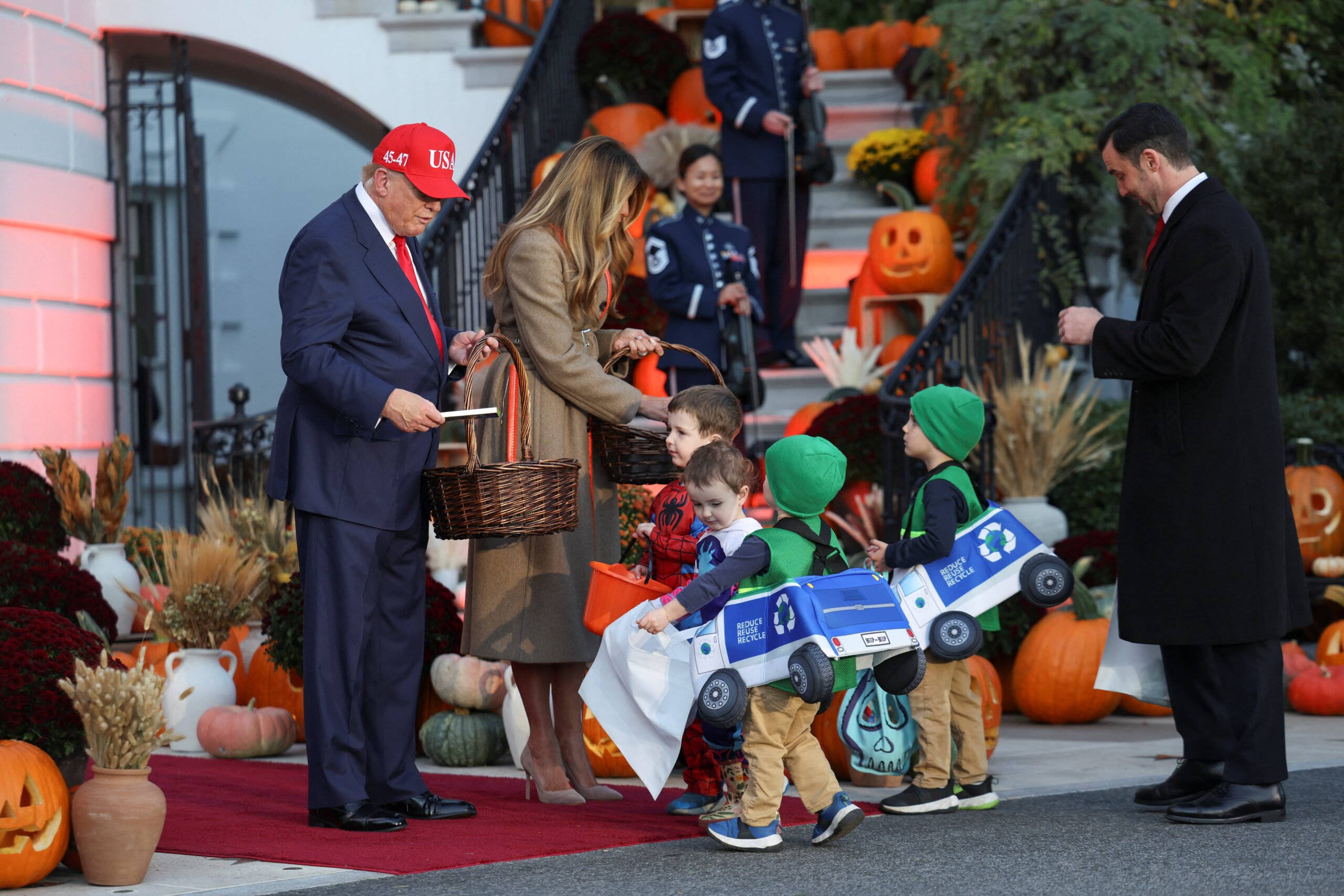 Υπό τους ήχους του εμβληματικού «Thriller» του Μάικλ Τζάκσον, το προεδρικό ζεύγος εμφανίστηκε χαμογελαστό, μοιράζοντας σοκολάτες και γλυκά στα παιδιά που είχαν σχηματίσει ουρές στον South Drive του Λευκού Οίκου. Ο Τραμπ αντάλλαξε ένα high-five με ένα αγοράκι ντυμένο… Τραμπ, το οποίο φορούσε μπλε κοστούμι και καπέλο MAGA, ενώ στο πλευρό του βρισκόταν ένα κορίτσι ντυμένο με λευκή καμπαρντίνα — εμφανώς εμπνευσμένη από το στιλ της Μελάνια.
