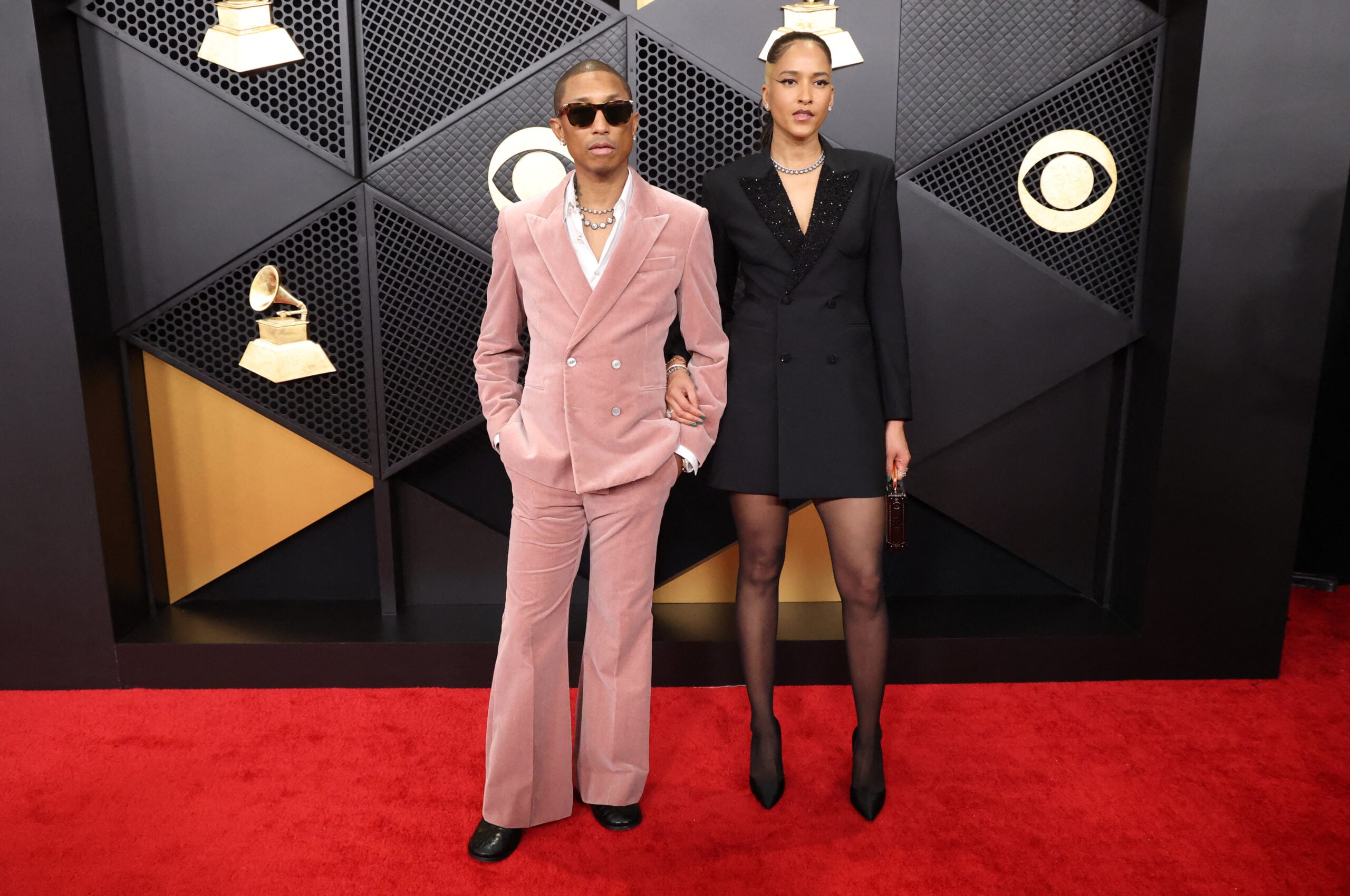 Ο Pharrell Williams με βελούδινο κουστούμκι σε ροζ χρώμα φυσικά Louis Vuitton.