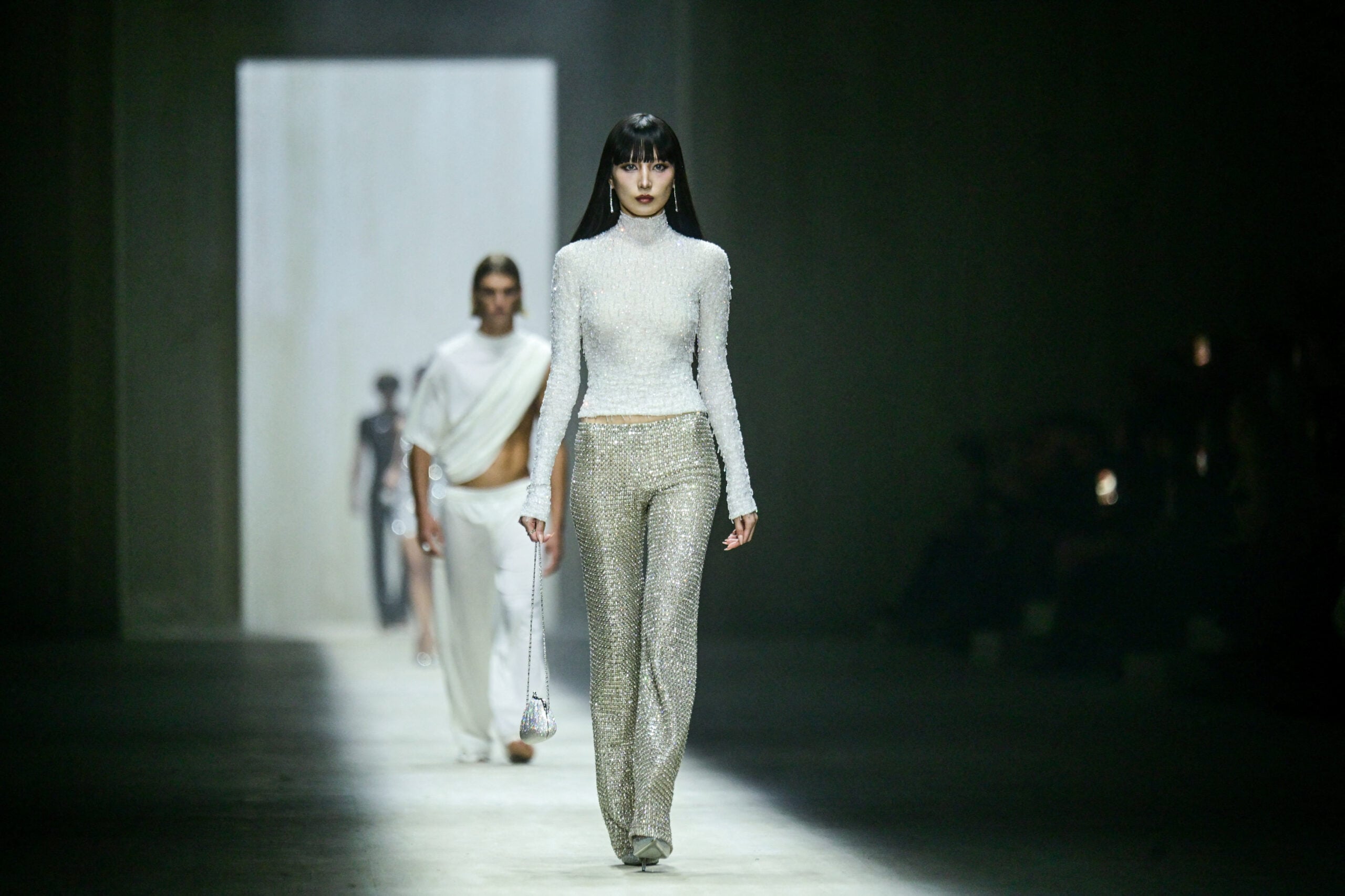 Η πασαρέλα μετατράπηκε σε μια σουρεαλιστική εκδοχή του Foro Italico. Μνημειακά αγάλματα, δραματικός φωτισμός και μια σχεδόν κινηματογραφική ατμόσφαιρα δημιούργησαν το ιδανικό σκηνικό για μια συλλογή που κινήθηκε ανάμεσα στο μεγαλείο και το “trash”.