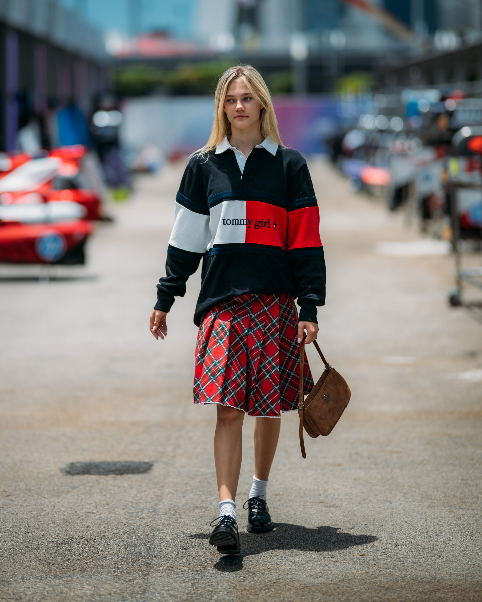 Όλα τα look της Alba Larsen ήταν από τη συλλογή TOMMY JEANS και περιλάμβαναν: Ένα σκούρο μπλε oversized rugby τοπ με τη σημαία Tommy, συνδυασμένο με κόκκινη καρό midi φούστα, λευκές κάλτσες και μαύρα brogues.
