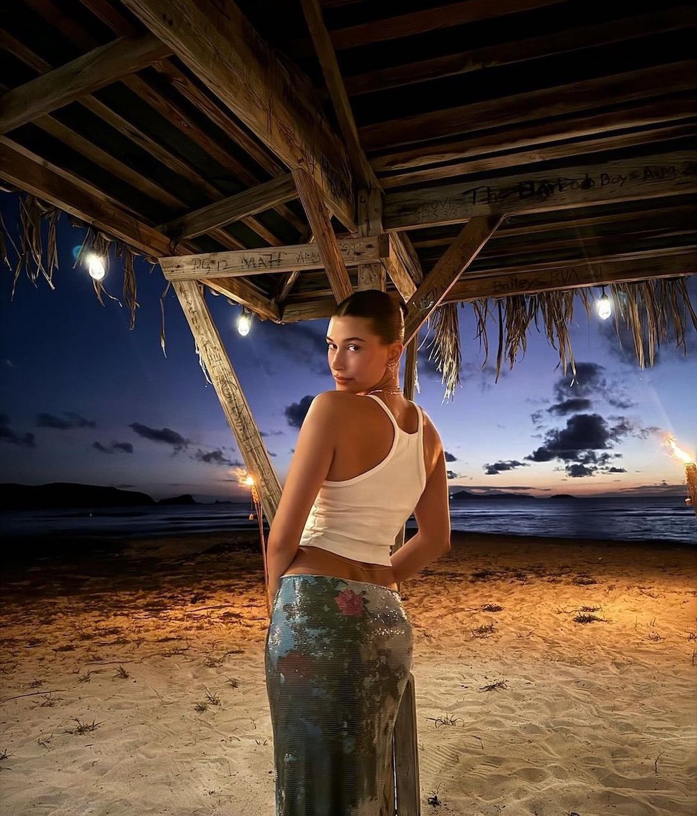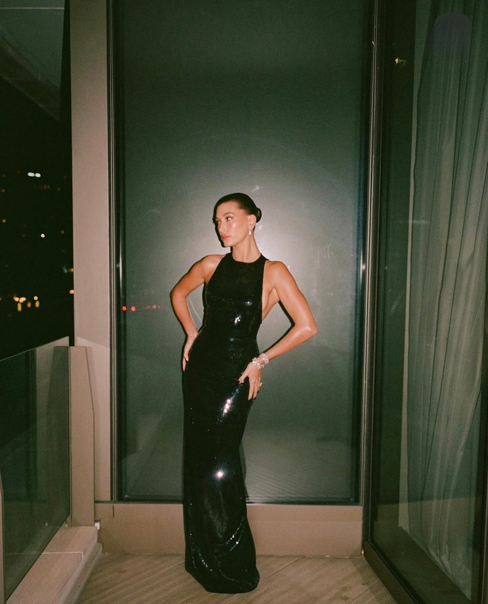Παρότι είναι γνωστή για τα denim παντελόνια και shorts, τα oversized jackets και τα bodycon φορέματα, η Χέιλι Μπίμπερ εμφανίζεται πολύ συχνά και με παγιέτες.