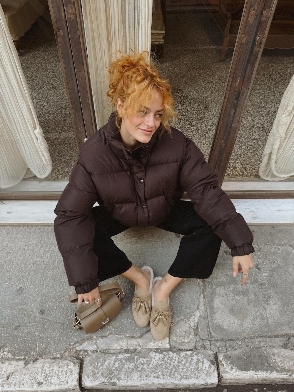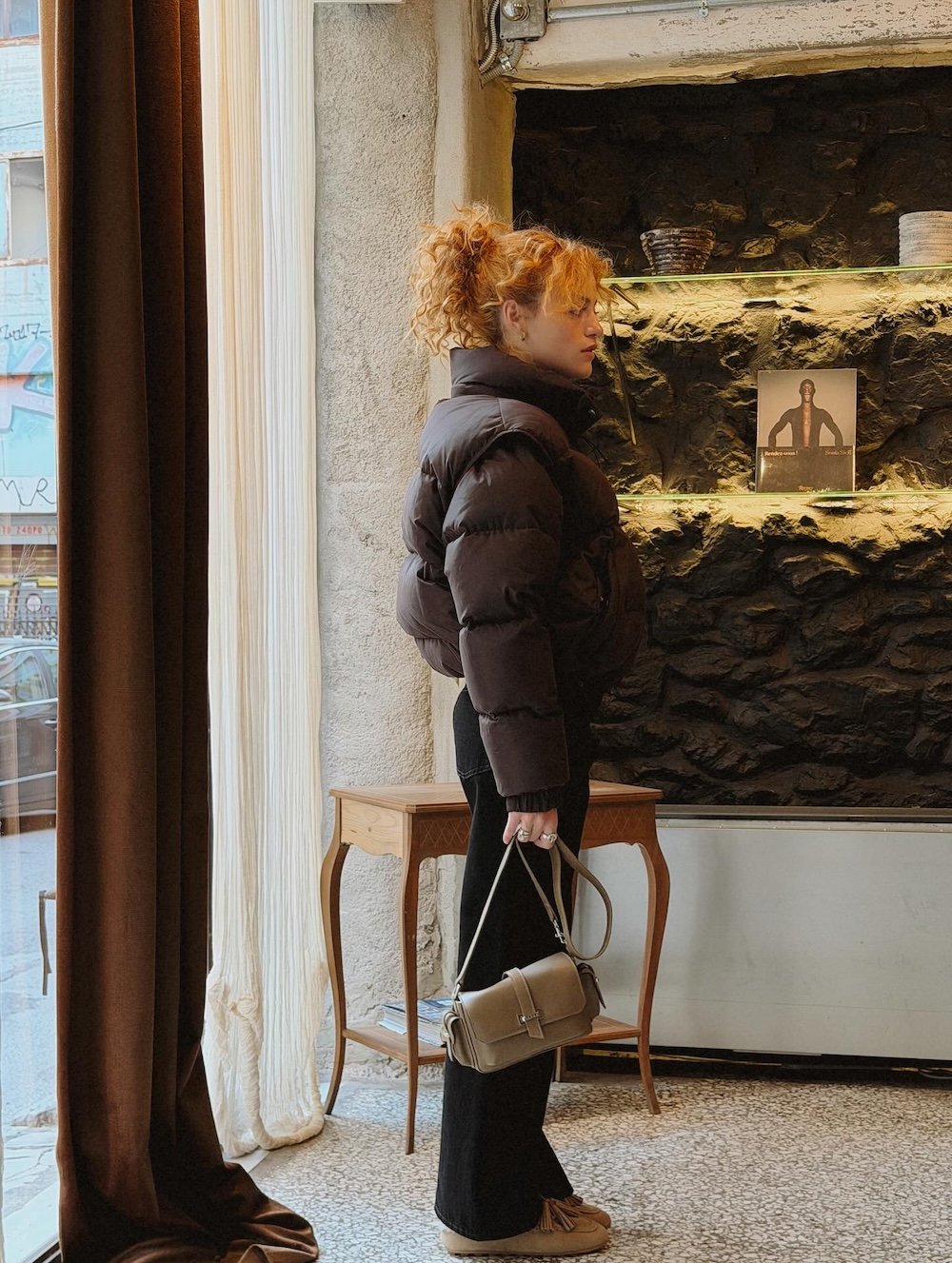 Το look της είναι δομημένο με καθαρούς όγκους και φυσικές υφές. Το καφέ puffer jacket λειτουργεί ως κεντρικό σημείο, ενώ το μαύρο cropped παντελόνι κρατά τη σιλουέτα σύγχρονη και πρακτική. Το αποτέλεσμα δεν είναι statement, αλλά μια απλή και καλά υπολογισμένη στιγμή στυλ. Το βλέμμα της παραμένει συγκεντρωμένο, σαν να παρατηρεί τον κόσμο χωρίς να προσπαθεί να τον εντυπωσιάσει.