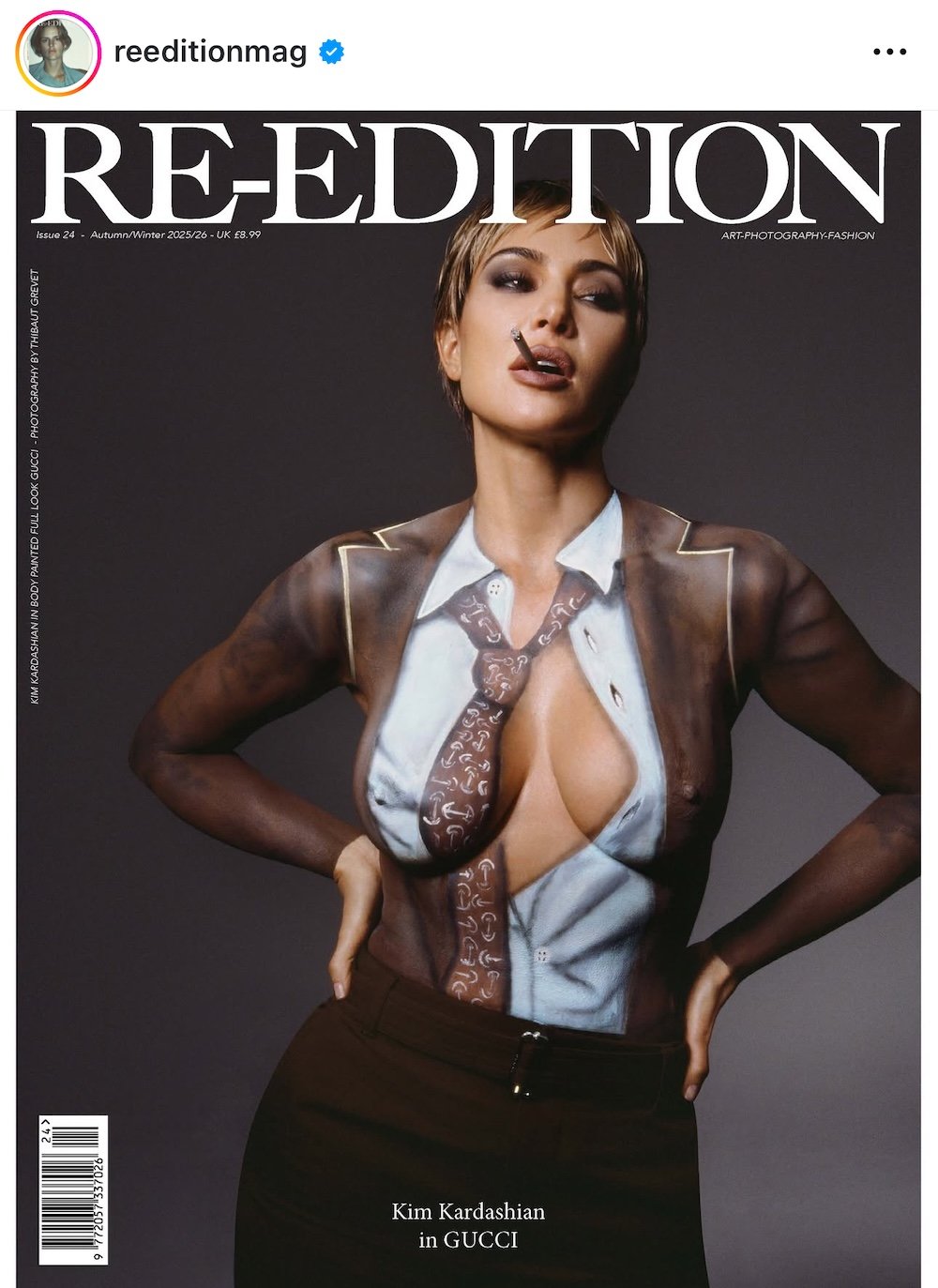 Η Κιμ Καρντάσιαν, γνωστή για την επιδραστική της παρουσία στη μόδα και την αυτοπροβολή, συμμετείχε σε μία φωτογράφιση για το περιοδικό Re Edition που συζητήθηκε ευρέως. Χρησιμοποιώντας την τέχνη του body painting, η Καρντάσιαν εμφανίστηκε γυμνή, με ζωγραφισμένα ρούχα στο σώμα της, δημιουργώντας μια οπτική ψευδαίσθηση που συνδυάζει μόδα και τέχνη.