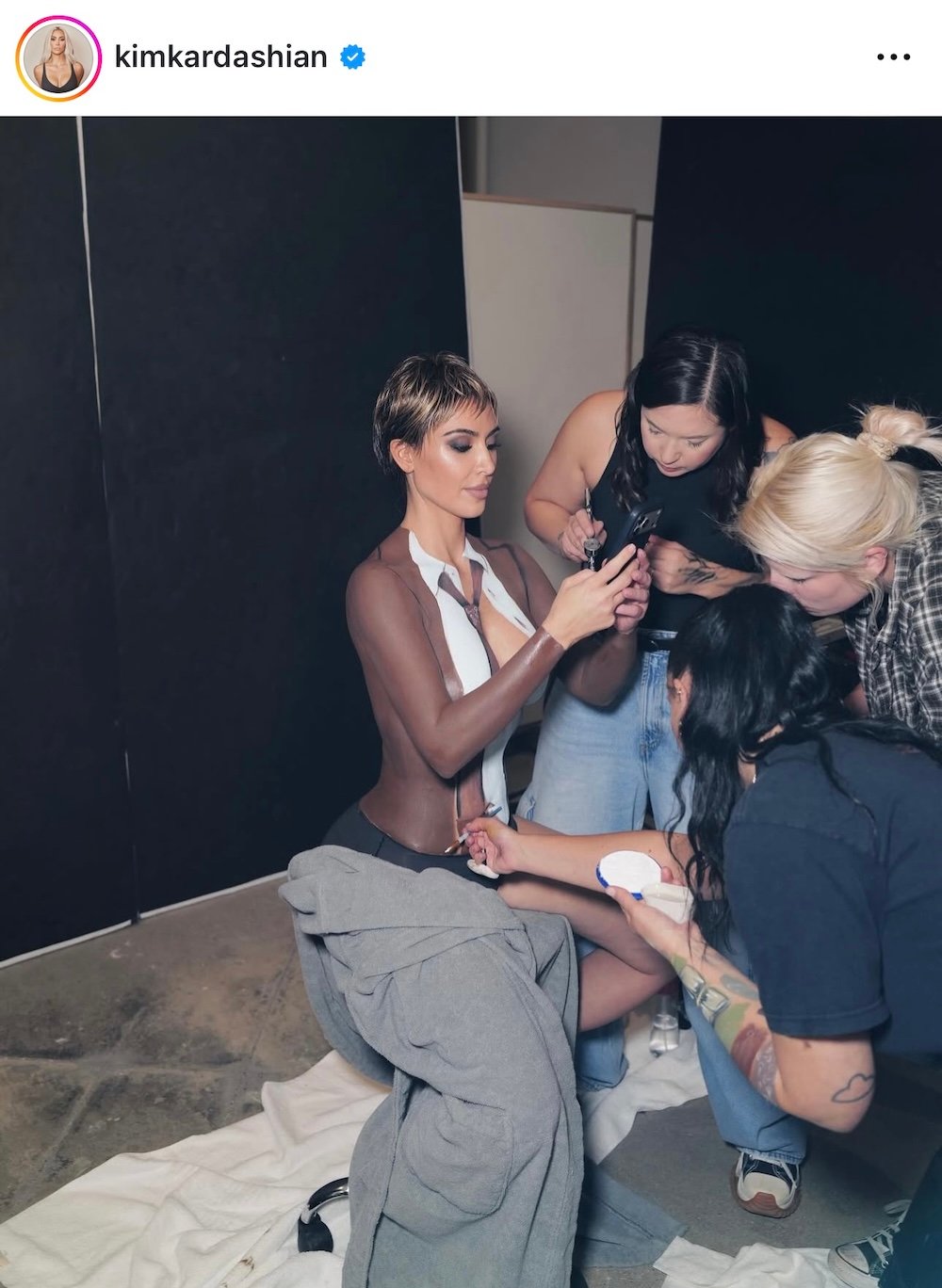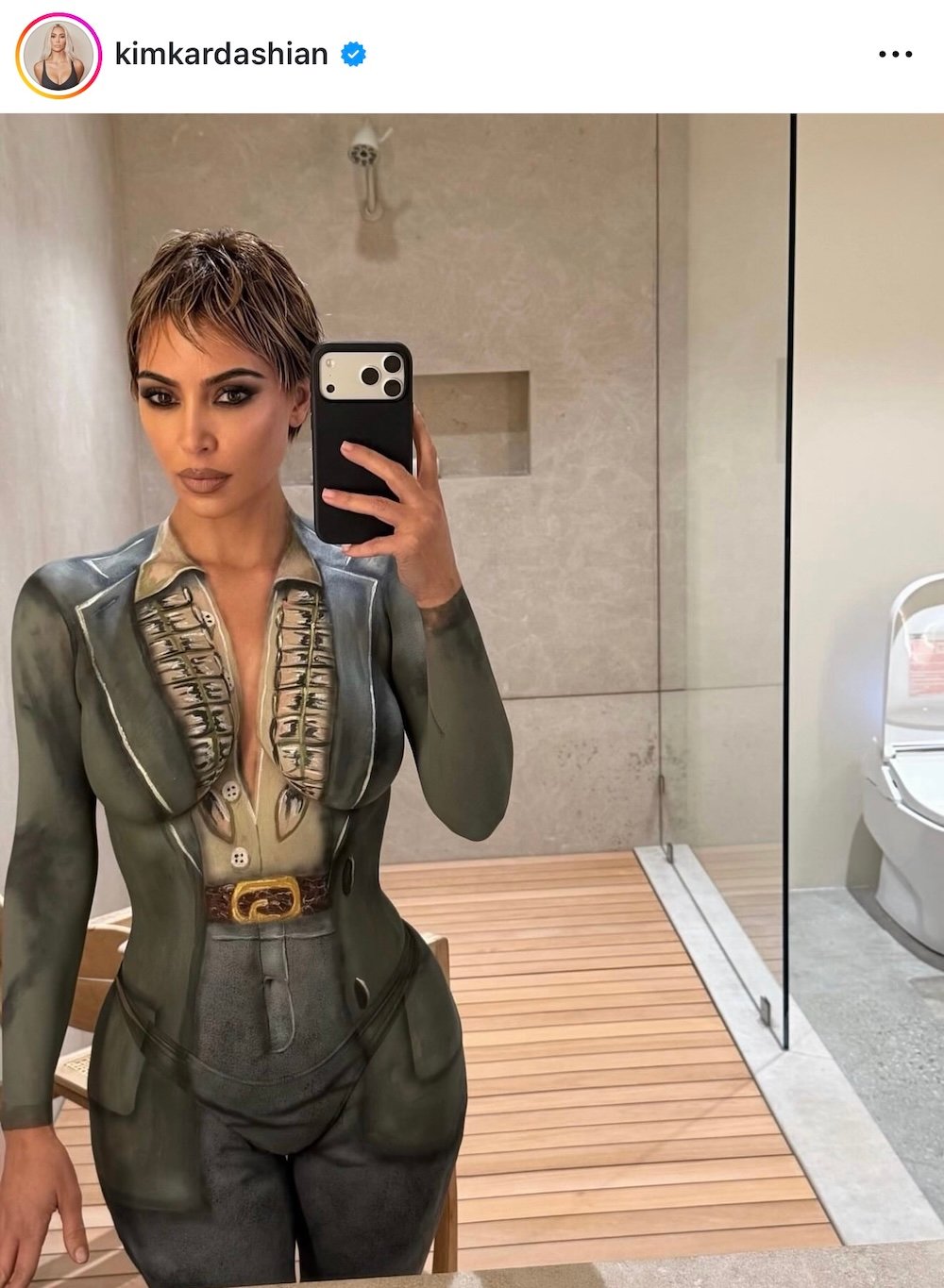 Σε άλλες λήψεις, η Κιμ Καρντάσιαν συνδυάζει ζωγραφισμένα στοιχεία με αληθινά ρούχα, παίζοντας με τα όρια ανάμεσα στο πραγματικό και το φανταστικό.
