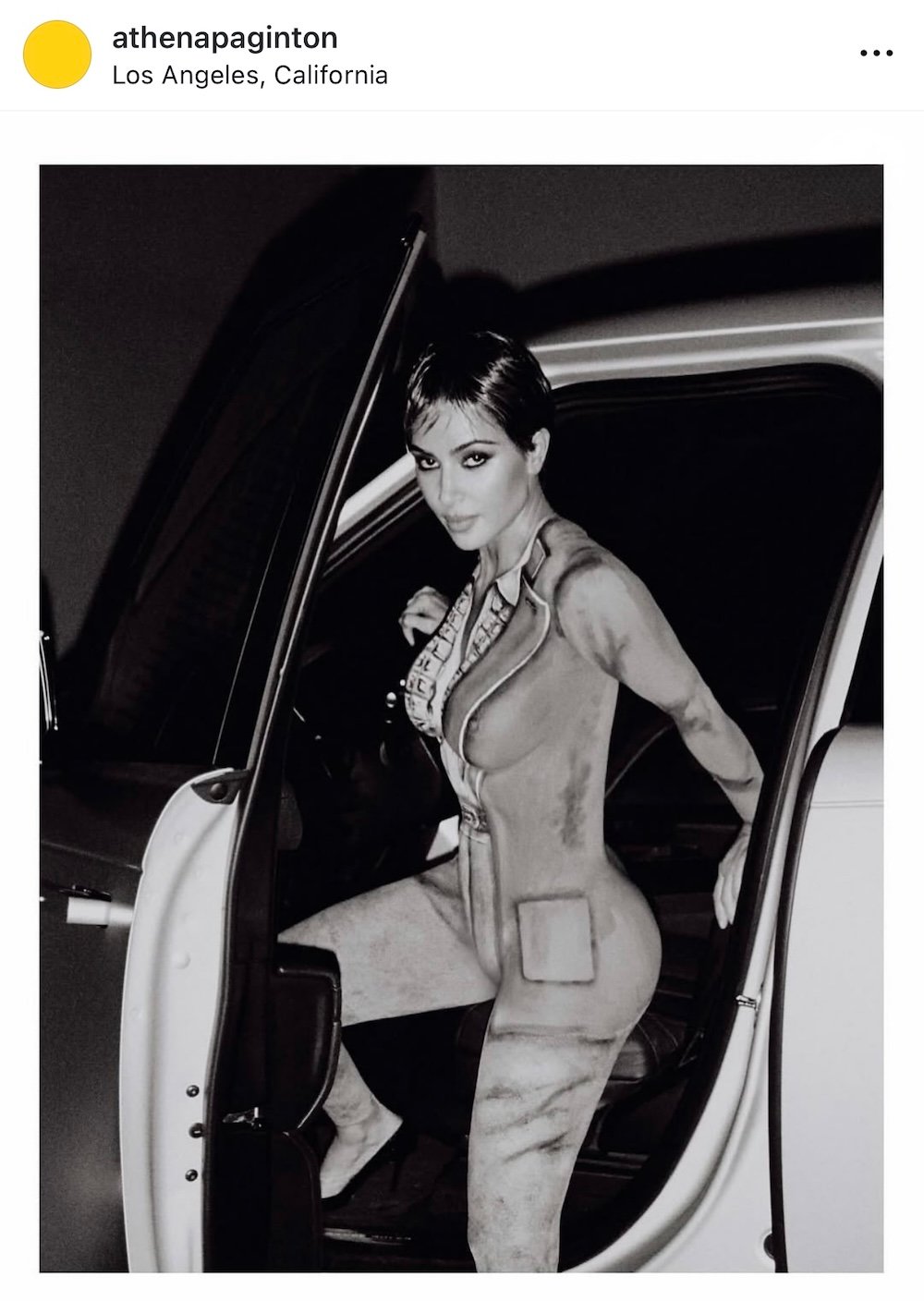 Ο φακός του Thibaut Grevet και το ταλέντο της καλλιτέχνιδας Athena Paginton ένωσαν τις δυνάμεις τους για να δημιουργήσουν μια οπτική ψευδαίσθηση υψηλής αισθητικής. Το σώμα της Κιμ Καρντάσιαν φαίνεται να φορά τζιν παντελόνι, λευκό πουκάμισο με γραβάτα και σακάκι, όλα ζωγραφισμένα επάνω της.