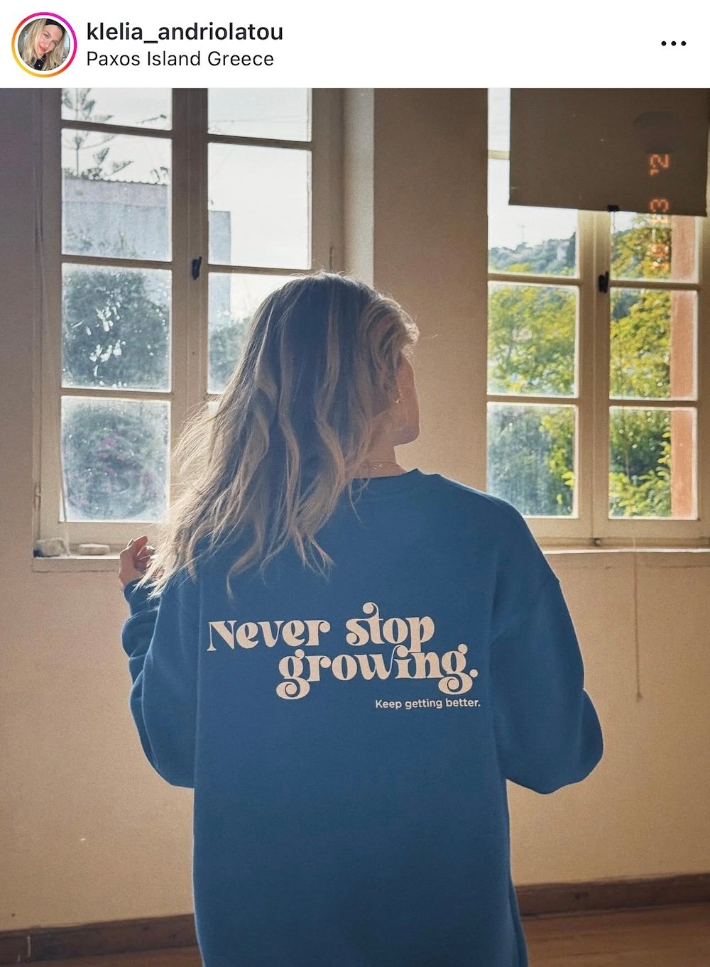 Αυτό ακριβώς το είδος ρούχου επέλεξε πρόσφατα και η Κλέλια Ανδριολάτου, σύμφωνα με ανάρτησή της στο Instagram. Στις φωτογραφίες, η ηθοποιός φορά μια βαμβακερή, μακρυμάνικη μπλούζα σε παστέλ γαλάζιο χρώμα, με στάμπα που έγραφε “don’t stop growing”. Το συνδύασε με ίσιο denim παντελόνι, αθλητικά παπούτσια και κάλτσες, αναδεικνύοντας την παιδική, ανεπιτήδευτη πλευρά της. Φωτογραφήθηκε καθισμένη στο πάτωμα, στο φυσικό φως της ημέρας, με τα μαλλιά της ανάλαφρα και χωρίς makeup.