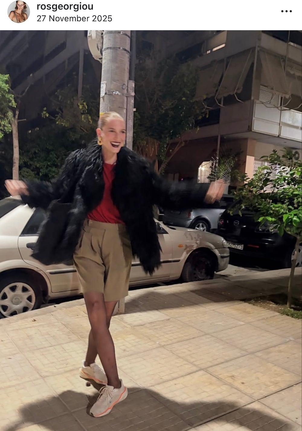 Το outfit αποτελείται από μια οικολογική γούνα, ένα top και ένα σορτς, συνδυασμένα με καλσόν και αθλητικά παπούτσια, δημιουργώντας ένα ξεχωριστό αποτέλεσμα που είναι ταυτόχρονα ζεστό και άνετο. Η Ρος Γεωργίου με την εμφάνισή της επιβεβαιώνει πώς το σορτς μπορεί να φορεθεί και τον χειμώνα, αρκεί να το συνδυάσουμε σωστά με layers και statement κομμάτια, για ένα look που ξεχωρίζει και παραμένει πρακτικό και stylish.