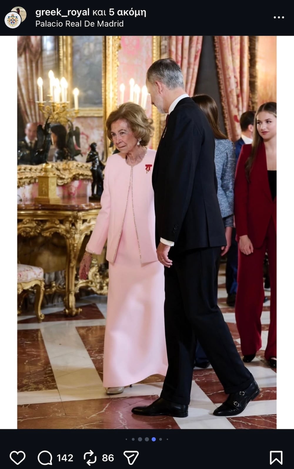 Η τελετή στο Παλάτιο Ρεάλ, όπου ο Βασιλιάς Φελίπε VI απένειμε στη μητέρα του το παράσημο Toisón de Oro, έφερε κοντά τρεις γενιές της ισπανικής μοναρχίας. Το ροζ, φορτωμένο με ιστορικό και συμβολικό βάρος, ενώνει το παρελθόν με το παρόν και παραμένει σταθερό στοιχείο στην εικόνα της Βασίλισσας Σοφίας, συνδέοντας την προσωπική της διαδρομή από την Ελλάδα στη σύγχρονη Ισπανία.