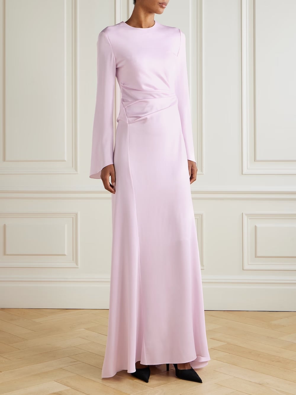Οι καθαρές γραμμές, η ελαφριά πτύχωση, η σατινέ επιφάνεια που παγιδεύει το φως χωρίς να το κρατά. Είναι ένα φόρεμα που δεν χρειάζεται στολίδια.