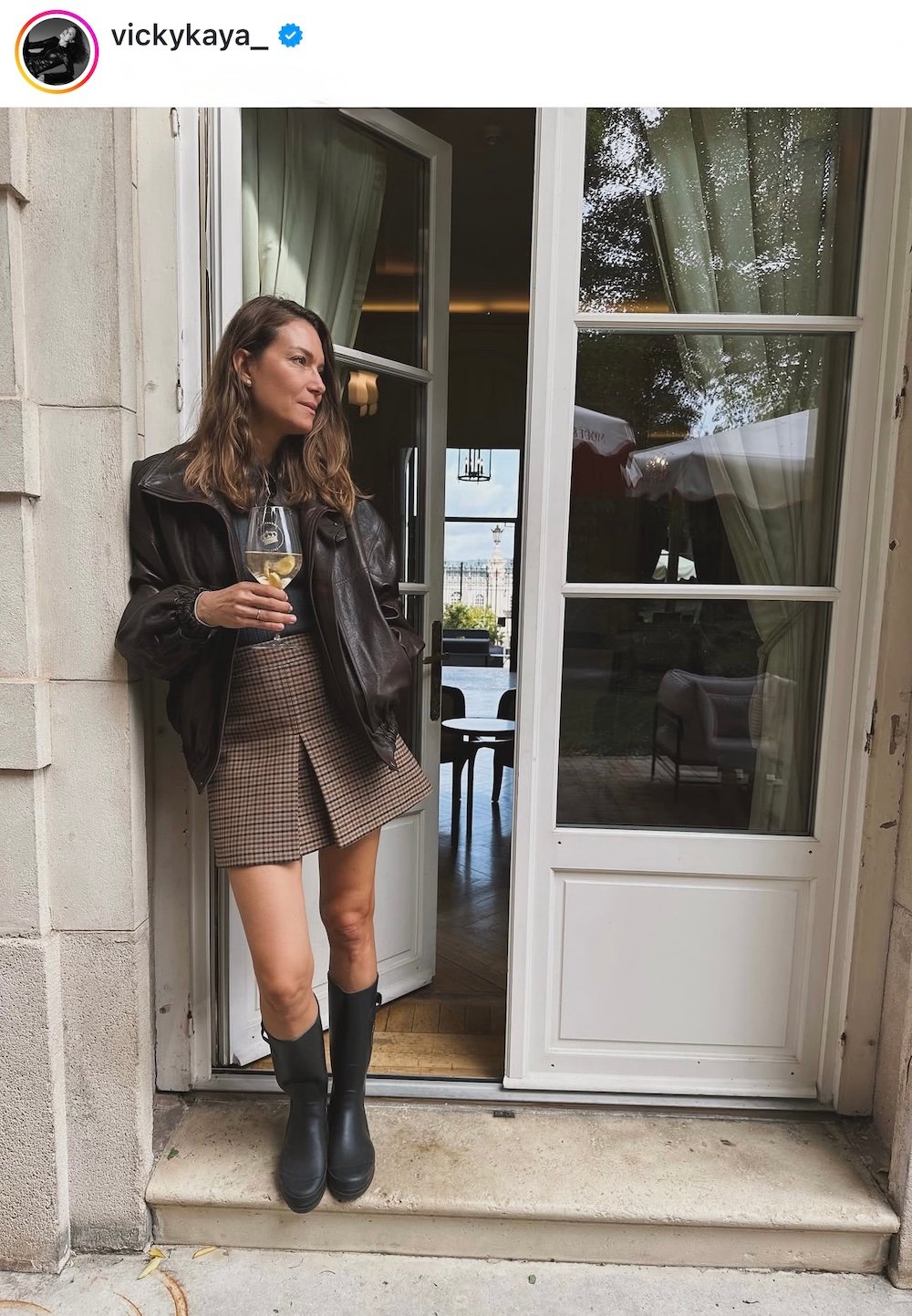 - Η Βίκυ Καγιά φόρεσε μια μίνι φούστα με αγγλικό στυλ, συνδυάζοντάς την με αδιάβροχες μπότες και over size δερμάτινο μπουφάν.