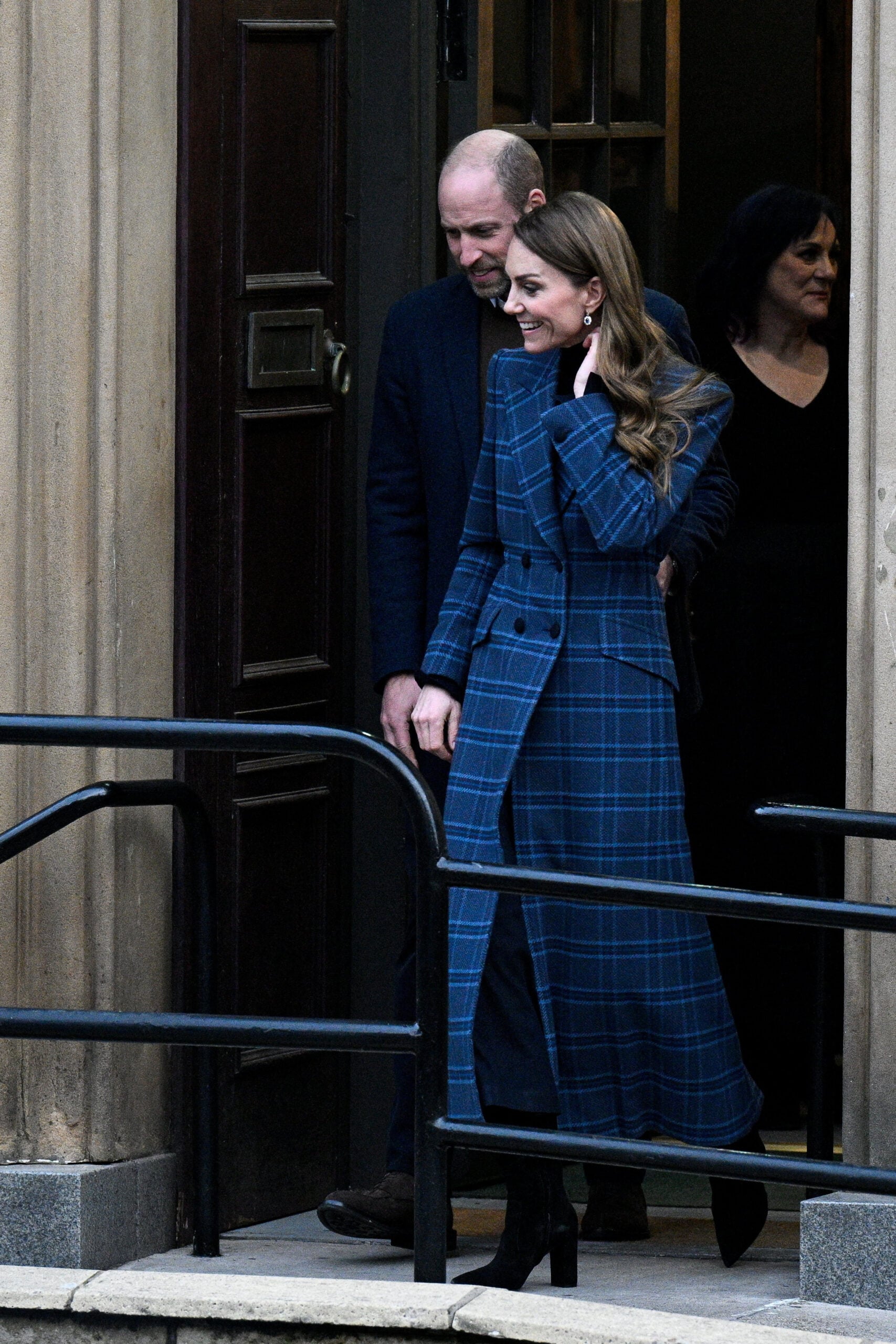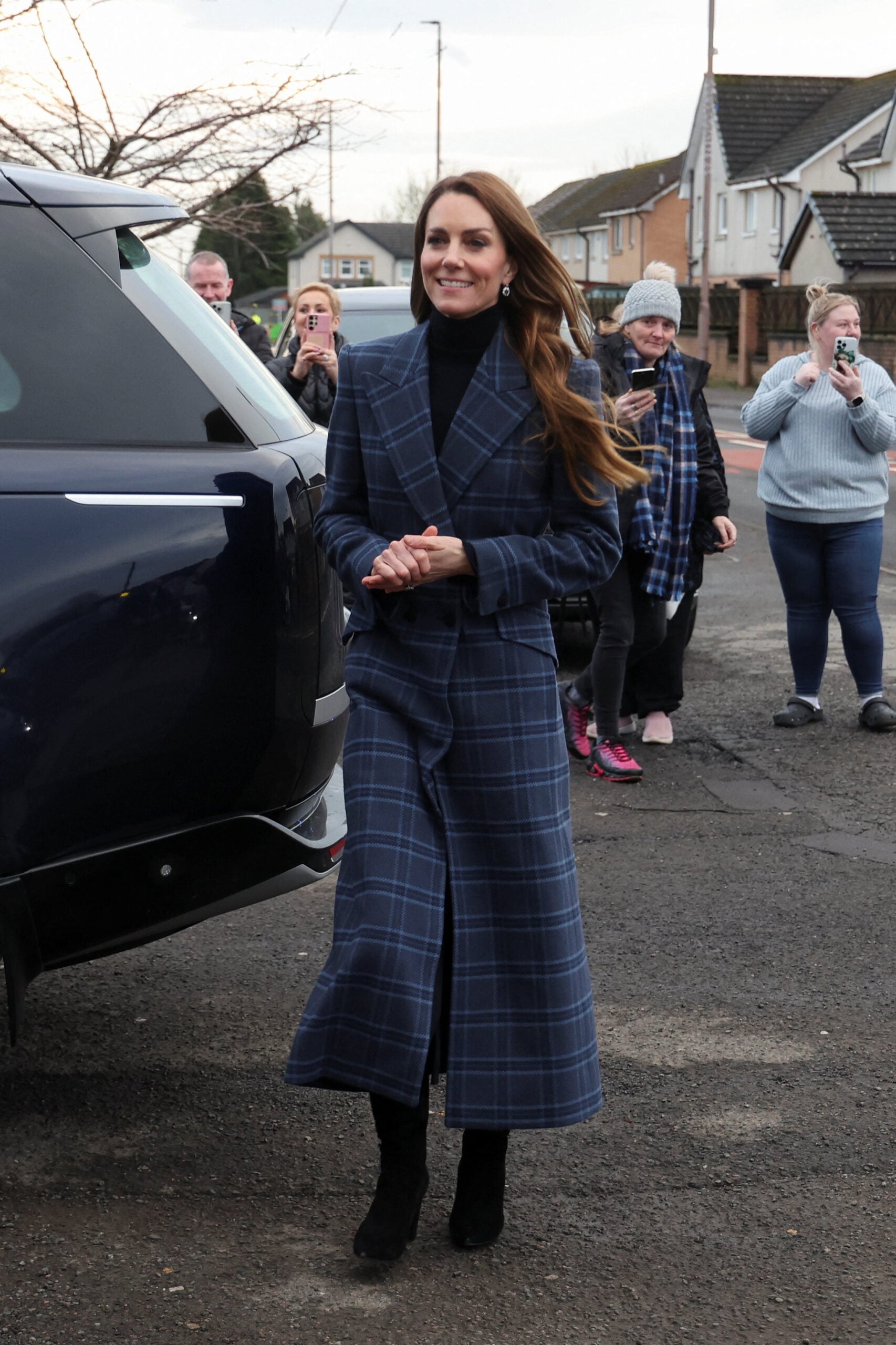 Για την περίσταση, φόρεσε ένα καρό παλτό σε αποχρώσεις του μπλε, τιμώντας το πιο χαρακτηριστικό μοτίβο της χώρας που επισκεπτόταν. Το συνδύασε με μαύρο ζιβάγκο, μαύρη midi φούστα και suede μπότες στην ίδια απόχρωση, δημιουργώντας μια καθαρή, ουδέτερη βάση. Το παλτό ήταν ο απόλυτος πρωταγωνιστής του συνόλου, δίνοντας winter χαρακτήρα και στιλιστική ταυτότητα χωρίς περιττές λεπτομέρειες.