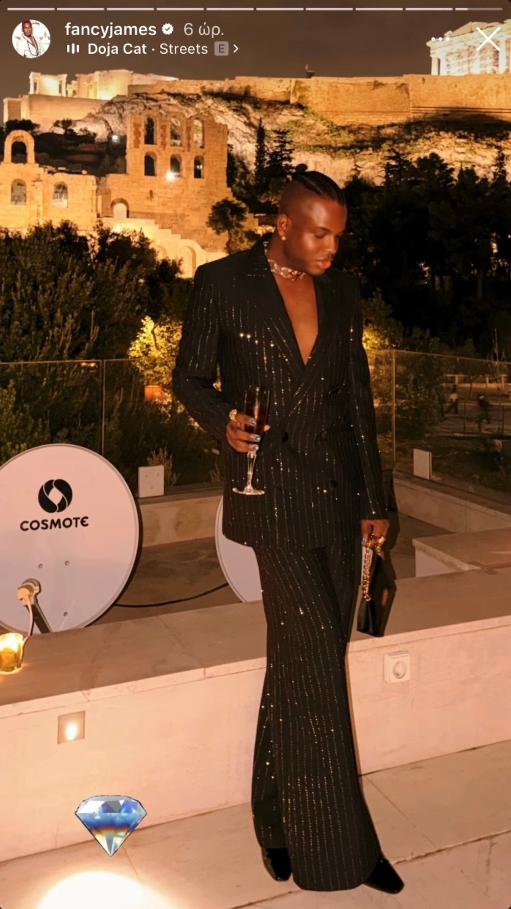 Λίγες ημέρες αργότερα, ο Fancy James βρέθηκε στην Αθήνα για το Marine Ball της αμερικανικής πρεσβείας. Επέλεξε μαύρο total look του David Koma, με μακρύ παλτό και πούπουλα, κρατώντας την Balenciaga Hourglass XS Top Handle Bag σε λευκό logo print. Η ανάρτησή του ήταν απλή, αλλά χαρακτηριστική «Honored to be part of such a beautiful evening celebrating the Marine Ball here in Greece»