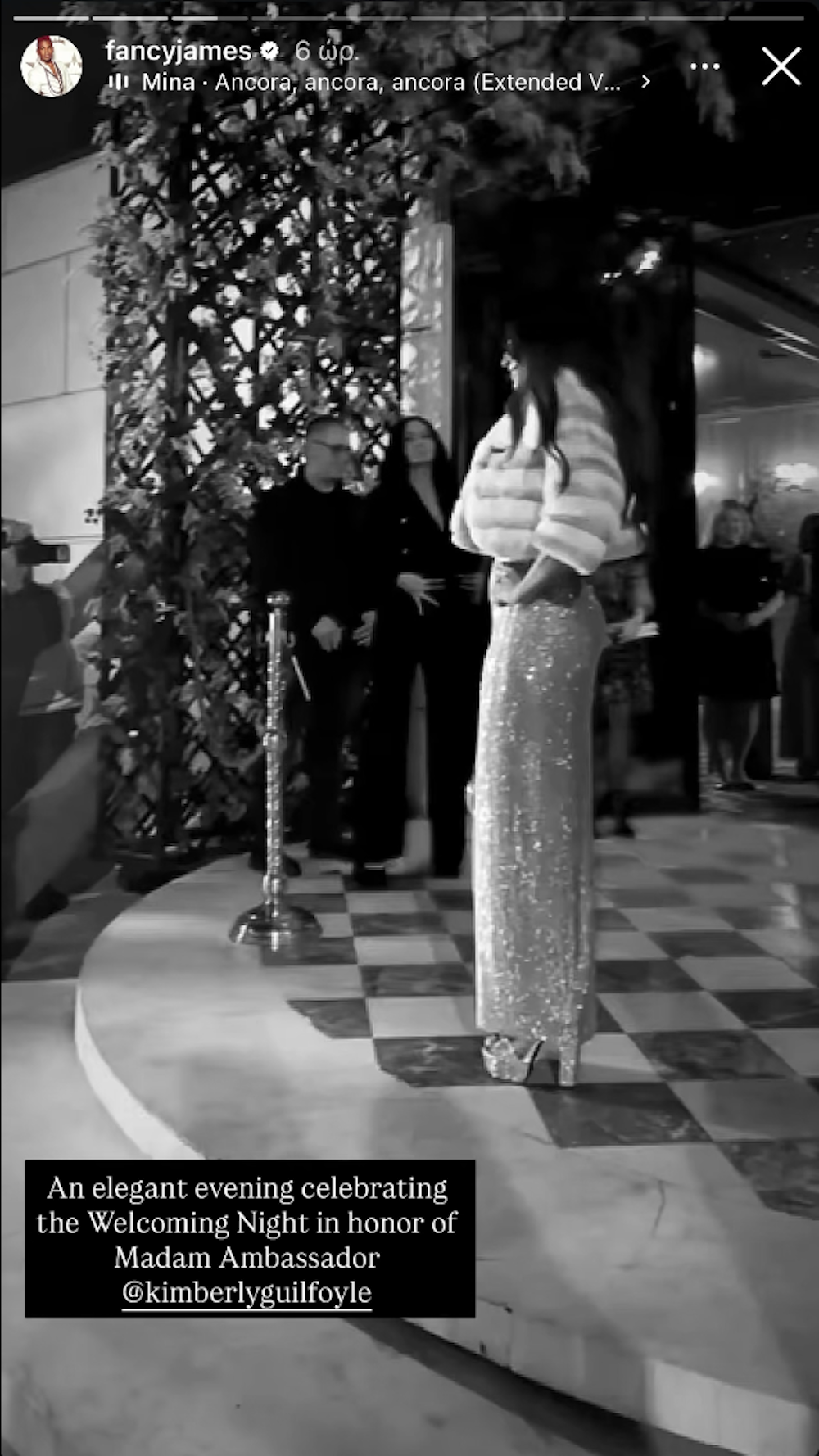 Ο Fancy James ανάρτησε βίντεο με τη φράση «An elegant evening celebrating the Welcoming Night in honor of Madam Ambassador @kimberlyguilfoyle», καθώς συνόδευε την πρέσβη σε αυτή τη γιορτή που συνδύαζε διπλωματία και αθηναϊκή νύχτα.
