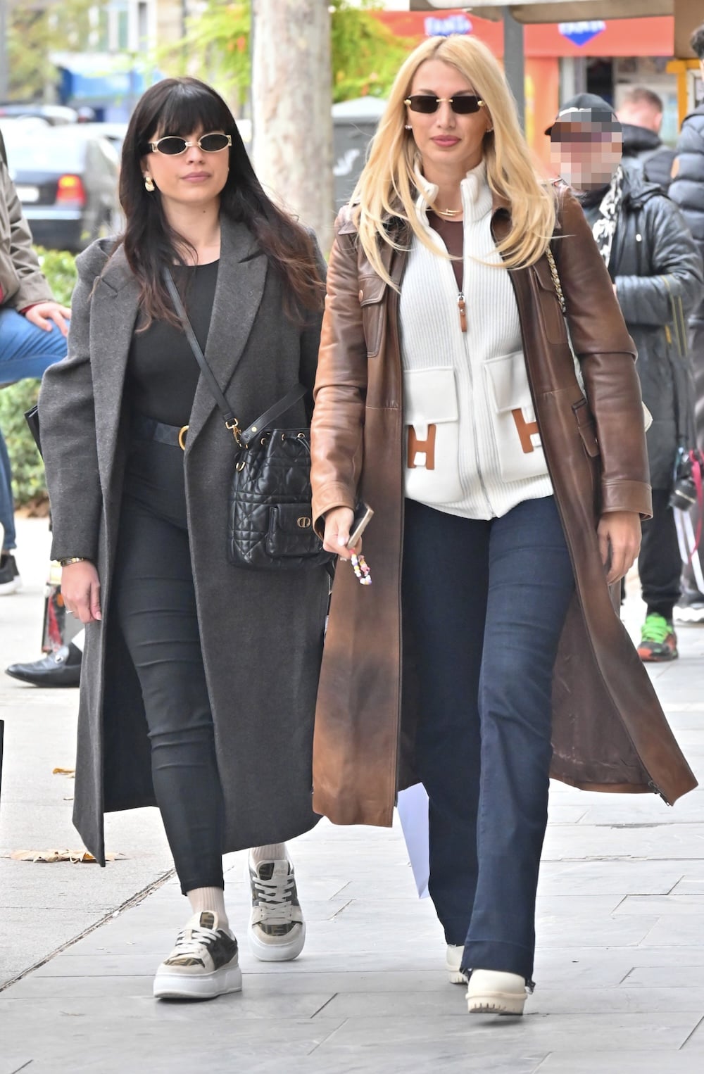 H αδελφή της προτίμησε μία χρωματικά πιο σκούρα εμφάνιση, με μαύρο παντελόνι, με ζώνη, και τοπ στο ίδιο χρώμα, μαύρη τσάντα, sneakers σε λευκό και πιο σκούρο, μαύρη καπιτονέ τσάντα και μακρύ παλτό σε γκρι χρώμα.