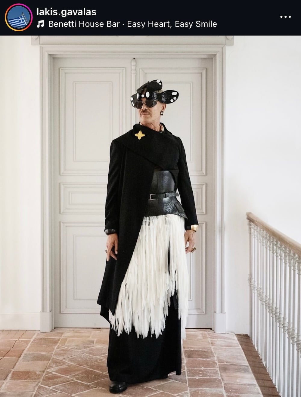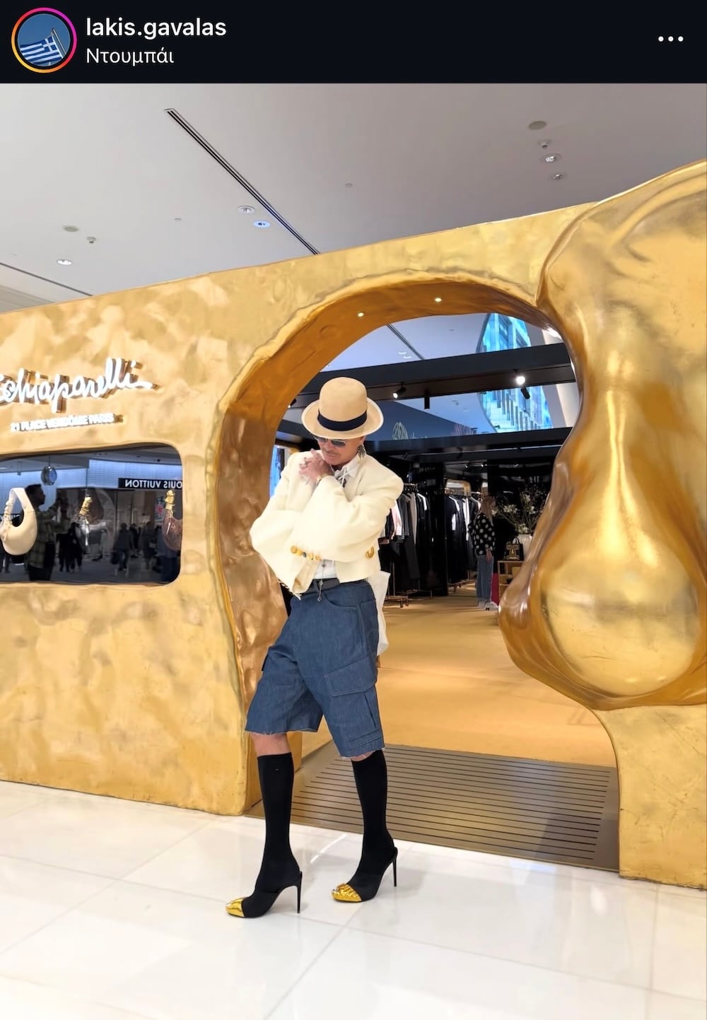 Το εκκεντρικό ντύσιμο του Λάκη Γαβαλά δεν είναι μεταμφίεση. Είναι αρχειακή πράξη. Κάθε κάπα, κάθε πουά, κάθε καπέλο, κάθε ακραία σιλουέτα λειτουργεί σαν αναφορά. Στην Elsa Schiaparelli, στον Patou, στο θέατρο, στο cabaret, στη δεκαετία του ’70, στην queer κουλτούρα, στη μόδα σαν τέχνη και σαν σχόλιο. Ο Γαβαλάς δεν φοράει «ρούχα». Φοράει γνώση ενσωματωμένη στο σώμα. Γι’ αυτό και η εκκεντρικότητά του δεν μοιάζει ποτέ με καρικατούρα. Είναι πάντα συγκεκριμένη. Μελετημένη. Σαν να ξέρει ακριβώς γιατί στέκεται έτσι, γιατί κρατά αυτό το αντικείμενο, γιατί σηκώνει το χέρι με αυτόν τον τρόπο. Και εδώ αρχίζει να γίνεται ενδιαφέρον το αντίθετο άκρο.