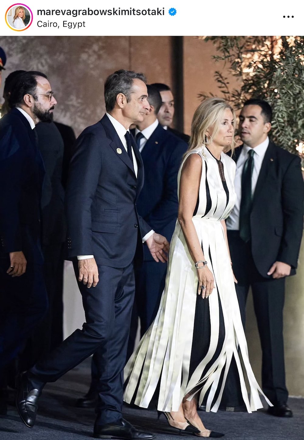 Πρόσφατα, σε μια εκδήλωση στο Κάιρο για τα εγκαίνια του νέου μουσείου, φόρεσε ένα πολύ ωραίο φόρεμα με έντονες μεταξωτές λωρίδες, το οποίο συνδύασε με slingback γόβες που αφήνουν εκτεθειμένη τη φτέρνα και προσδίδουν κομψότητα και θηλυκότητα.