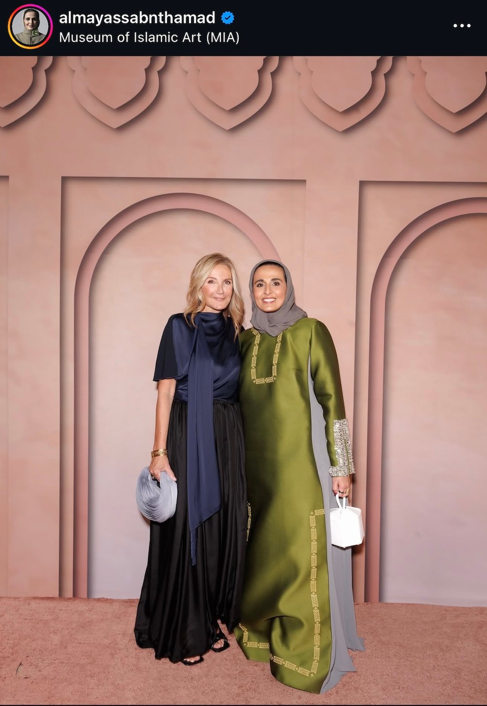 Η Sheikha Al Mayassa, η γυναίκα που έχει μεταμορφώσει το Κατάρ σε διεθνές κέντρο τέχνης, υποδέχτηκε τους καλεσμένους με ένα green embroidered abaya-inspired ensemble. Τα ασημένια κεντήματα, η αρχιτεκτονική γραμμή και η σύγχρονη couture λεπτομέρεια απέδωσαν την αισθητική της φιλοσοφία. Η μόδα σαν πολιτιστική επιμέλεια αλλά και προέκταση της ταυτότητας ενός έθνους. Κάθε της εμφάνιση λειτουργεί ως curator moment — και το Franca Fund Gala Doha ήταν το πιο χαρακτηριστικό παράδειγμα.