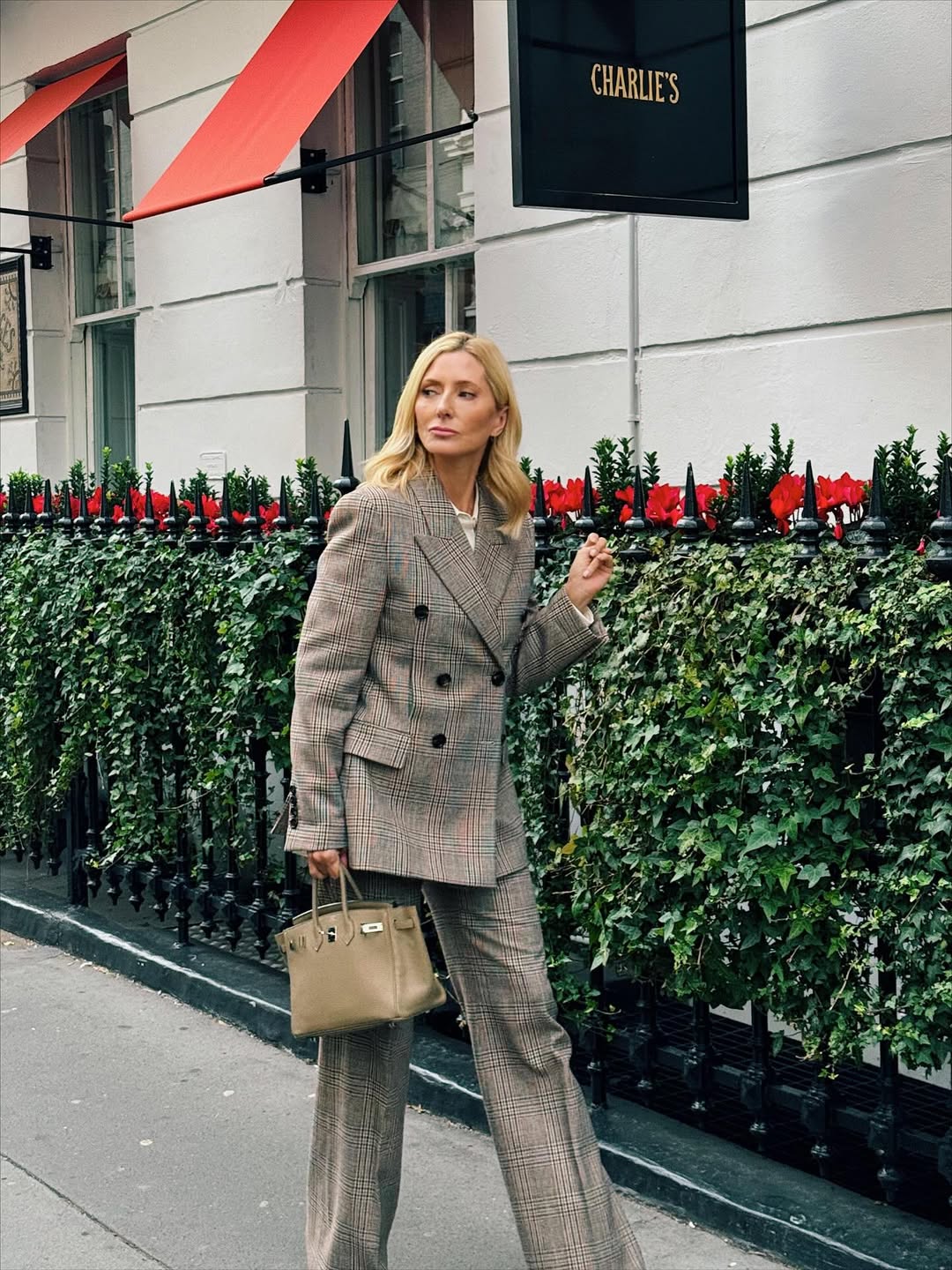 Η επιλογή της μπεζ Birkin τσάντας ήταν η απόλυτη fashion δήλωση: διαχρονική, πολυτελής και ταυτόχρονα υπερσύγχρονη, η τσάντα έδινε στο σύνολο μία αίσθηση effortless luxury. Το μπεζ χρώμα της δεν ήταν απλώς ουδέτερο – λειτουργούσε σαν φωτεινή νότα που ισορροπούσε τις πιο έντονες γραμμές του καρό, δημιουργώντας ένα παιχνίδι αντιθέσεων που ένωνε το business chic με το elevated street style. Κάθε λεπτομέρεια στην τσάντα, από το δέρμα μέχρι το iconic κούμπωμα, φώναζε διακριτική κομψότητα χωρίς να μοιάζει υπερβολική.
