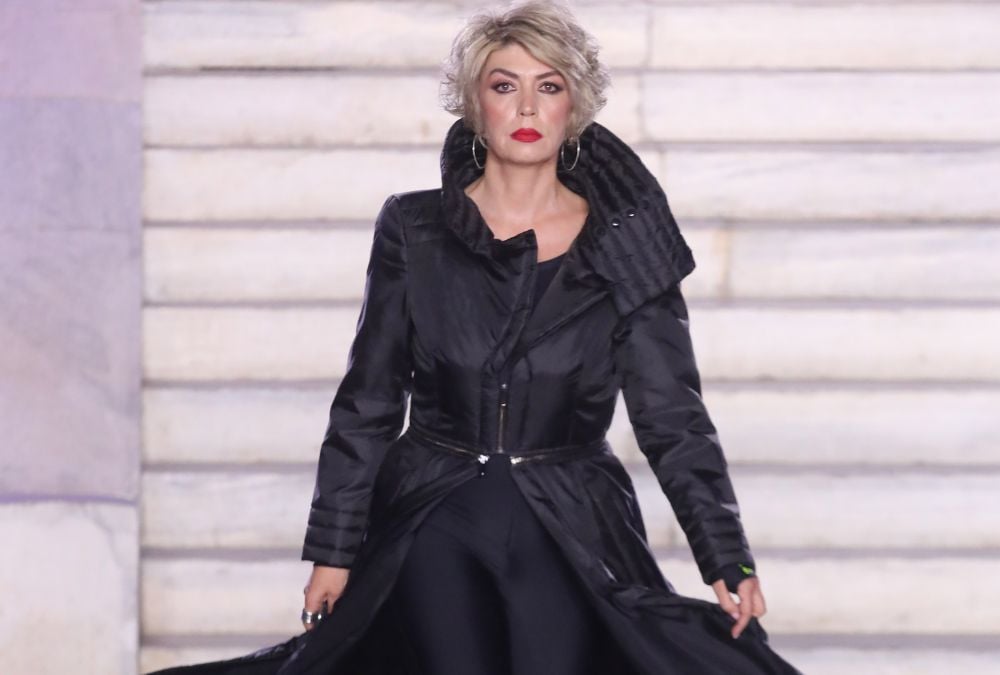 Η Μαρία Μάρκου εμφανίστηκε στη πασαρέλα, φορώντας μία ολόσωμη μαύρη φόρμα και ένα μακρύ μαύρο μπουφάν με μεγάλο γιακά. Το λουκ της συμπληρώθηκε με ψηλές μαύρες μπότες πάνω από το γόνατο.