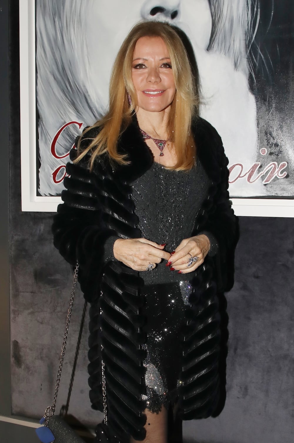 μαύρες μπότες κάτω από το γόνατο, με λεπτομέρεια γκλίτερ στη μύτη, μαύρη ζακέτα, μαύρο τσαντάκι με «ματάκια», διακοσμημένο με μαύρο φουλάρι με διάσπαρτα στρας, και κολιέ, πάλι με τα αγαπημένα της «ματάκια» πάνω, και με… λίγα στρας στα μαλλιά!