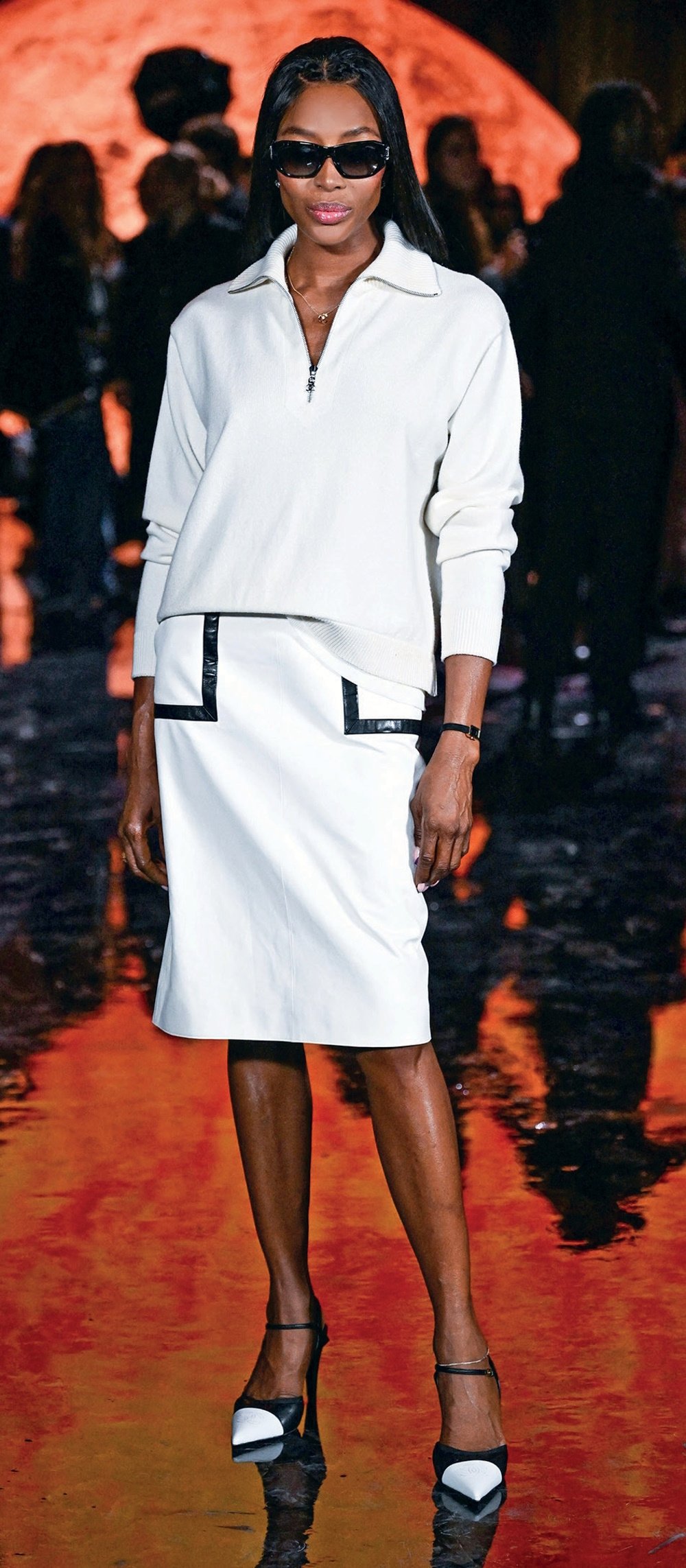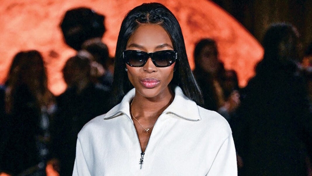 Η Ναόμι Κάμπελ εμφανίστηκε με black and white outfit, προσθέτοντας την υπογραφή της κομψότητας στο εντυπωσιακό σκηνικό της επίδειξης.