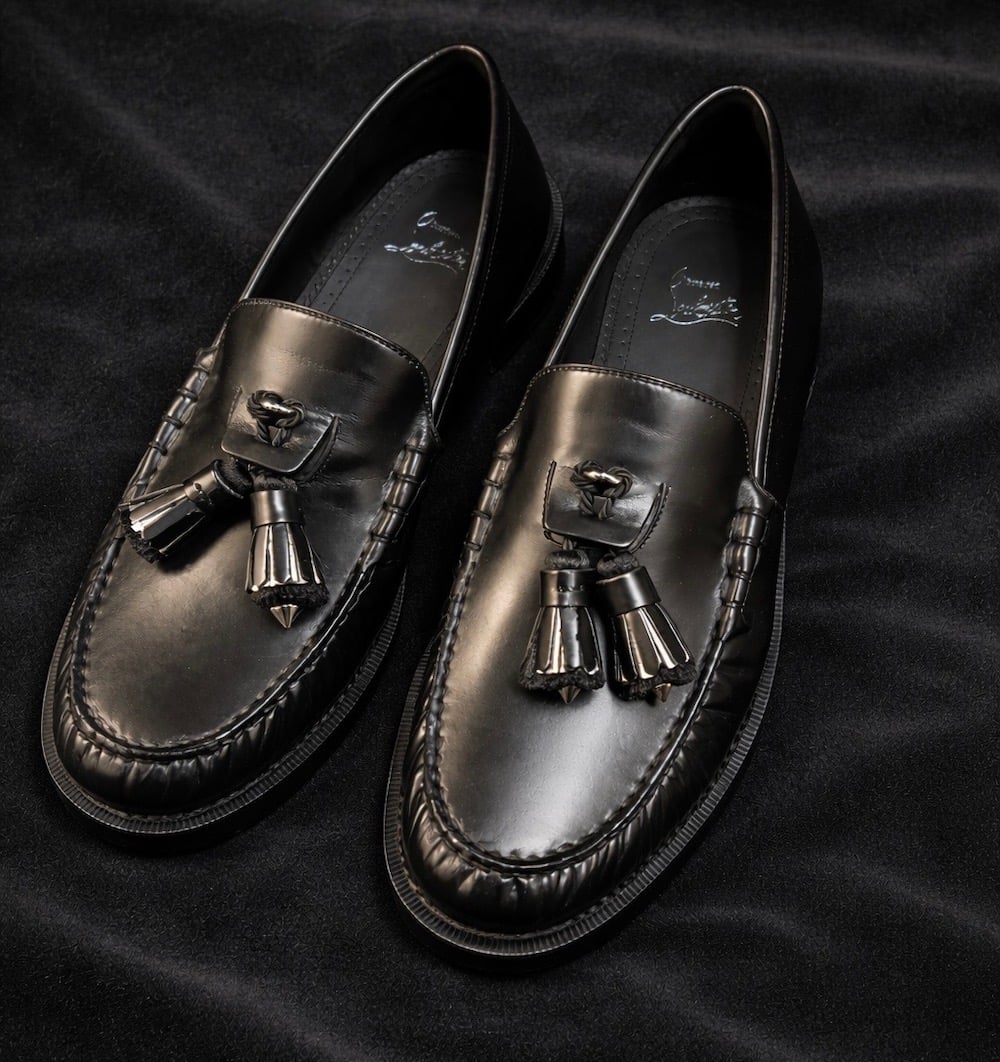 Τα tassel loafers του Christian Louboutin λειτουργούν σαν εξισορροπητικός παράγοντας. Εκεί όπου το σακάκι και το παντελόνι δίνουν βάρος και δομή, τα loafers φέρνουν ευελιξία. Δεν αποδυναμώνουν το look. Αντίθετα, το κάνουν πιο προσιτό, πιο ζωντανό. Δίνουν ρυθμό και αποτρέπουν το σύνολο από το να γίνει στατικό ή υπερβολικά αυστηρό. Σε αυτό το σημείο το style duality γίνεται σαφές.
