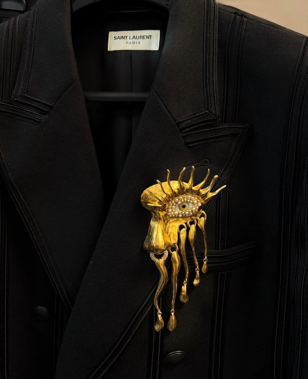 Η καρφίτσα του οίκου Schiaparelli, σχεδιασμένη από τον Daniel Roseberry, είναι το σημείο που μετακινεί το look. Δεν λειτουργεί σαν διακοσμητική λεπτομέρεια, αλλά σαν παρέμβαση που αλλάζει την ισορροπία. Με την παρουσία της, το σύνολο αποκτά μια πιο στοχαστική διάσταση. Δεν πρόκειται πια μόνο για ένα δυνατό tailoring, αλλά για κάτι που ανοίγει προς μια πιο πολιτισμική κατεύθυνση. Εκεί, το look αποκτά βάθος. Υπάρχει κάτι που θυμίζει μια φανταστική συγκέντρωση, όπου η αισθητική και η σκέψη συναντιούνται χωρίς προσπάθεια. Σαν μια σκηνή του Oscar Wilde, όπου το ρούχο γίνεται προέκταση της προσωπικότητας. Η αναφορά δεν είναι κυριολεκτική. Είναι υπόγεια, αλλά λειτουργεί.