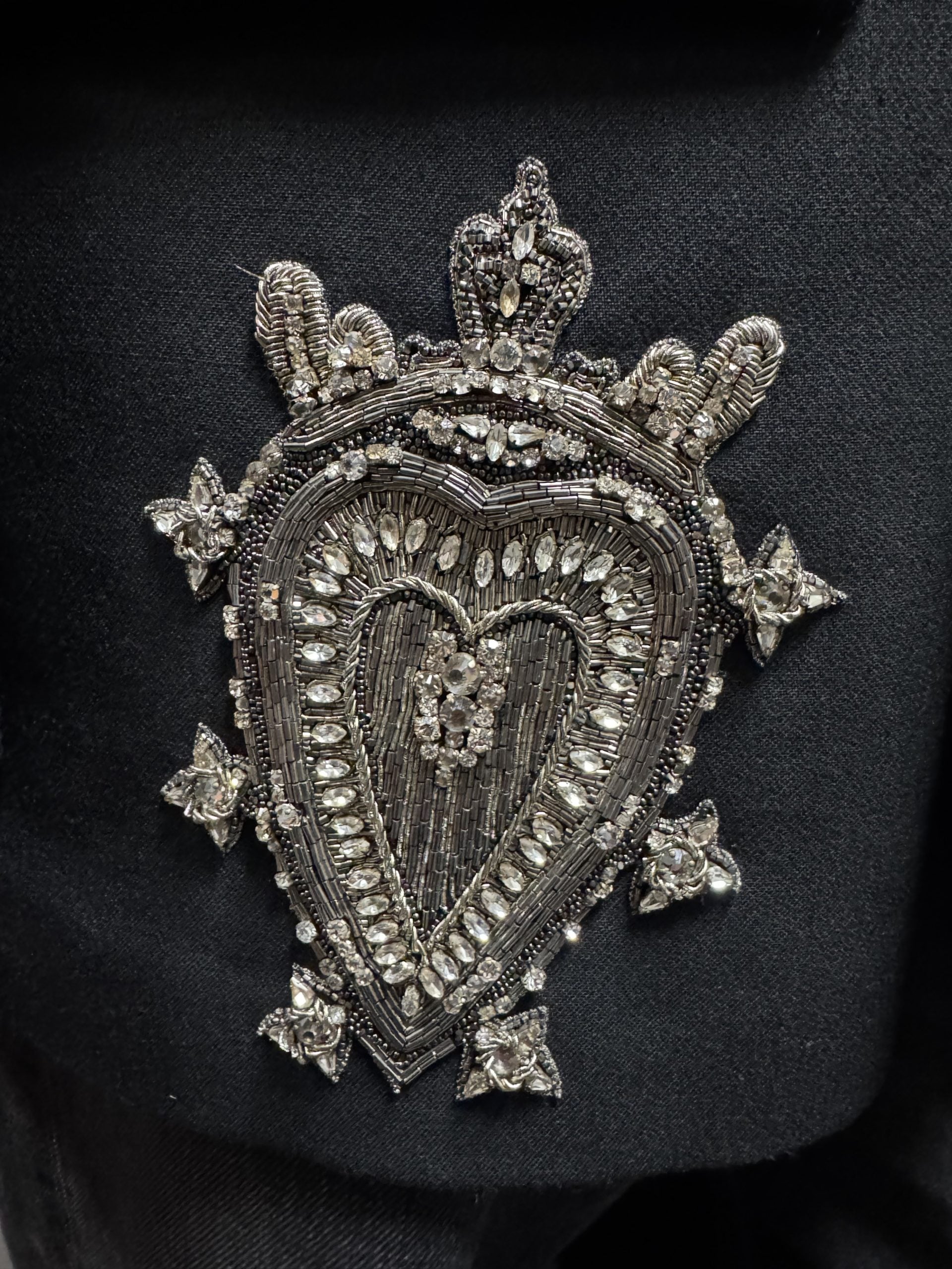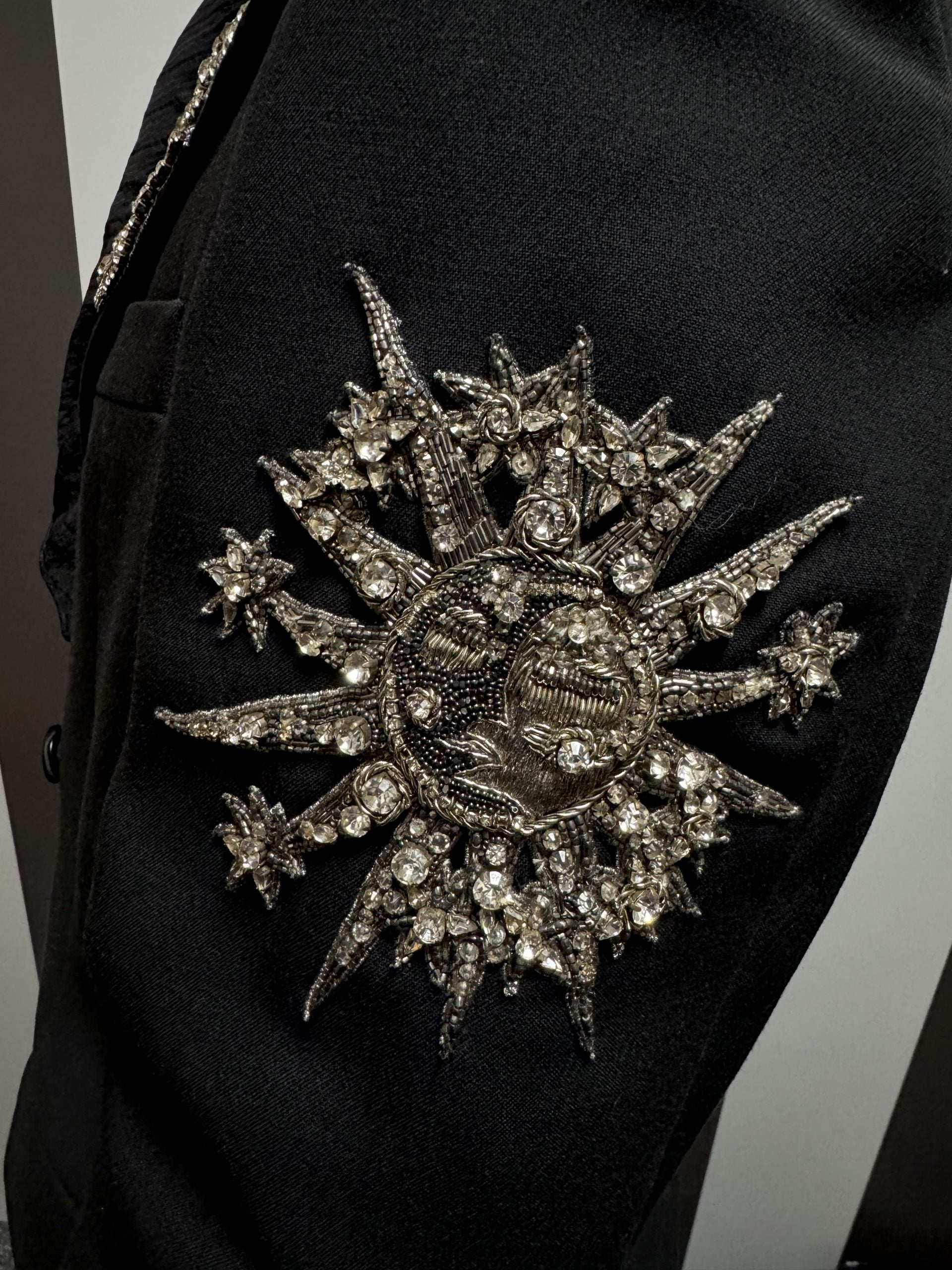 Τα περίτεχνα precious συμβολικά κεντήματα θυμίζουν σύμβολα ευημερίας. Στο πέτο ξεχωρίζει ένα περιστέρι, μια εικόνα που συχνά συνδέεται με την ειρήνη και την ελπίδα. Σε μια εποχή όπου οι συγκρούσεις εξακολουθούν να υπάρχουν σε πολλά μέρη του κόσμου, ένα τέτοιο σύμβολο αποκτά μια ιδιαίτερη σημασία. Δεν λειτουργεί μόνο σαν διακοσμητικό στοιχείο, αλλά σαν μια σιωπηλή υπενθύμιση ότι η ελπίδα για ειρήνη παραμένει πάντα παρούσα. Στο μανίκι εμφανίζεται ένα αστρικό κέντημα, ενώ ένα ακόμη μοτίβο καρδιάς προσθέτει μια ακόμη συμβολική διάσταση στο σακάκι. Όλα μαζί δημιουργούν ένα σύνολο γεμάτο εικόνες και νοήματα.
