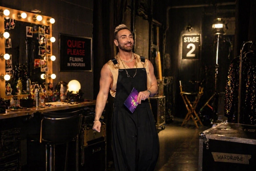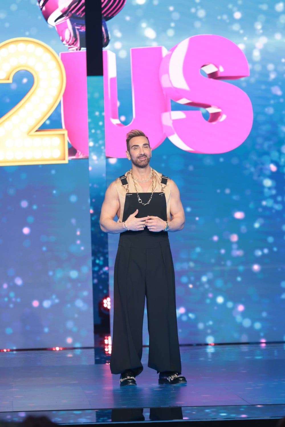 Η φράση workwear γίνεται υψηλή μόδα αποκτά νόημα όταν τη βλέπεις να λειτουργεί. Στο J2US, ο Νίκος Κοκλώνης εμφανίστηκε με μια bib overall του Balmain, συνδυασμένη με μεταξωτό sleeveless shirt από Celine, κοσμήματα από τον Kessaris και vintage Dior shoes. Το αποτέλεσμα δεν βασίζεται στην εντύπωση, αλλά στη δομή. Δεν υπάρχει προσπάθεια να «μεταμφιεστεί» το ρούχο. Η overall παραμένει αυτό που είναι. Και αυτό είναι που κάνει τον συνδυασμό να δουλεύει.
